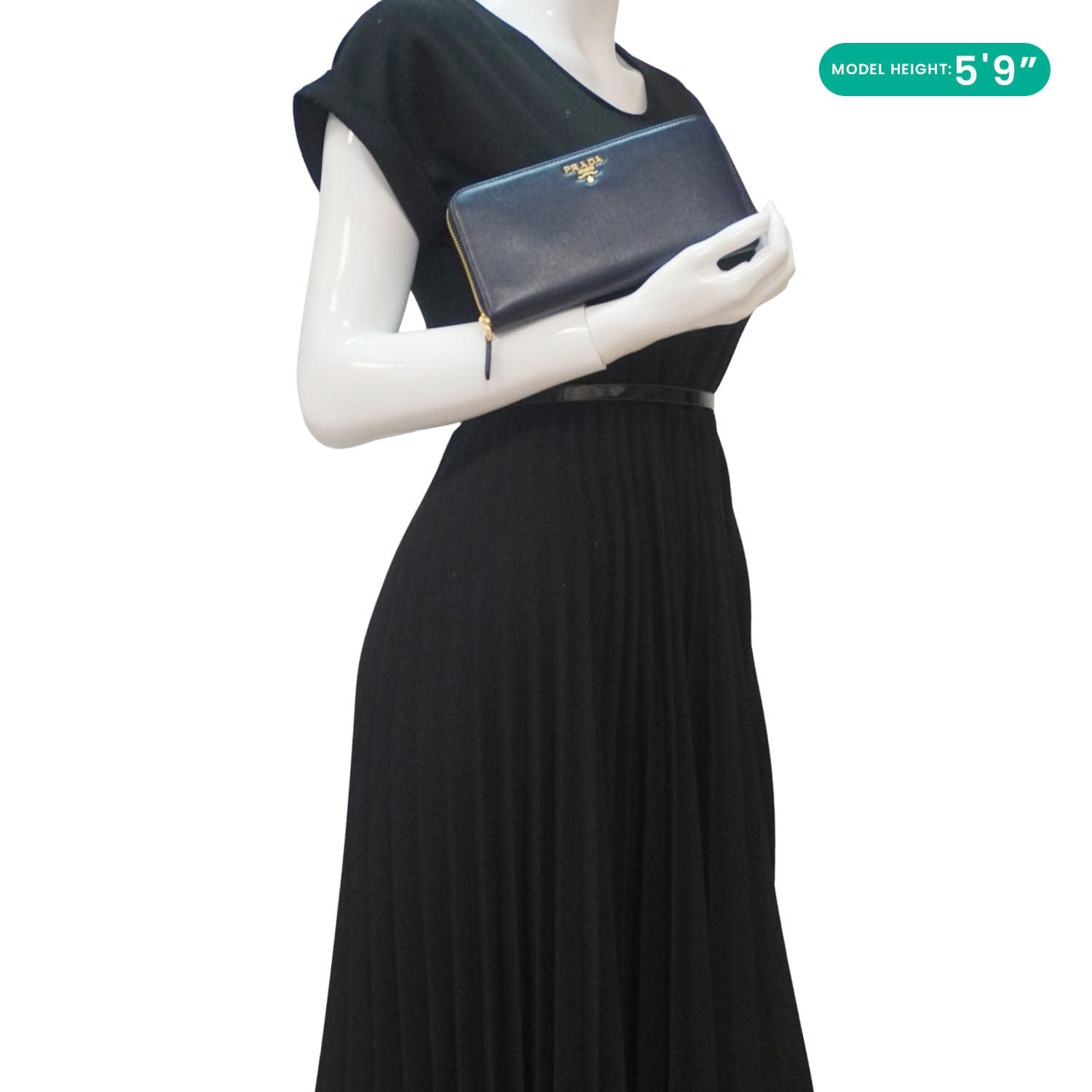 The Prada zip-around leather wallet in blue is a stylish and functional accessory. Made from premium leather, it offers multiple compartments and card slots, secured with a sturdy zip closure.