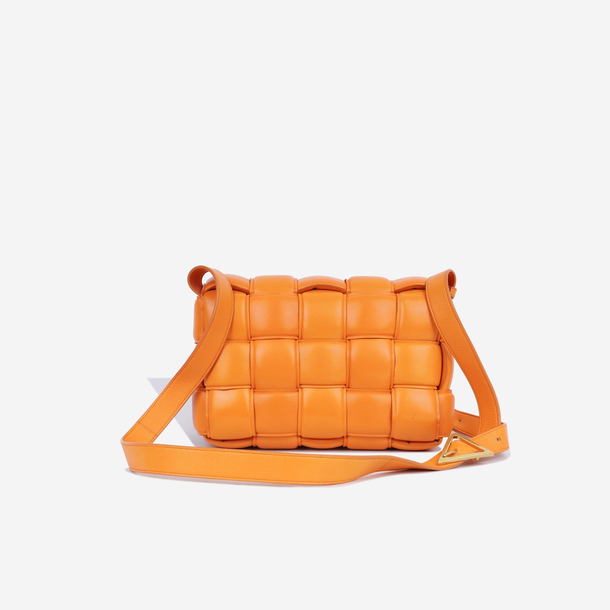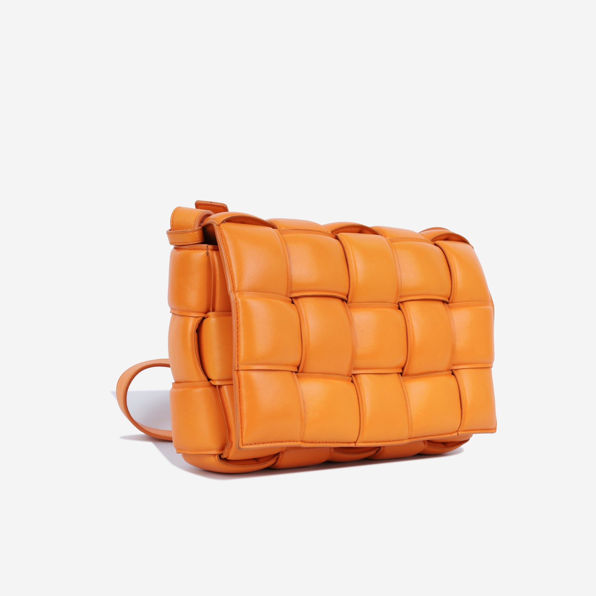 Bottega Veneta present a playful, inventive and hugely popular twist to their classic intrecciato weaving technique for their 2020 hit, the Padded Cassette Bag. The Cassette offers a modern and functional interpretation of the classic woven crossbody bags typically offered by the brand. Carefully crafted in bright orange leather, in a soft, boxy, structured silhouette, this bag offers practicality as well as an abundance of it-bag value.