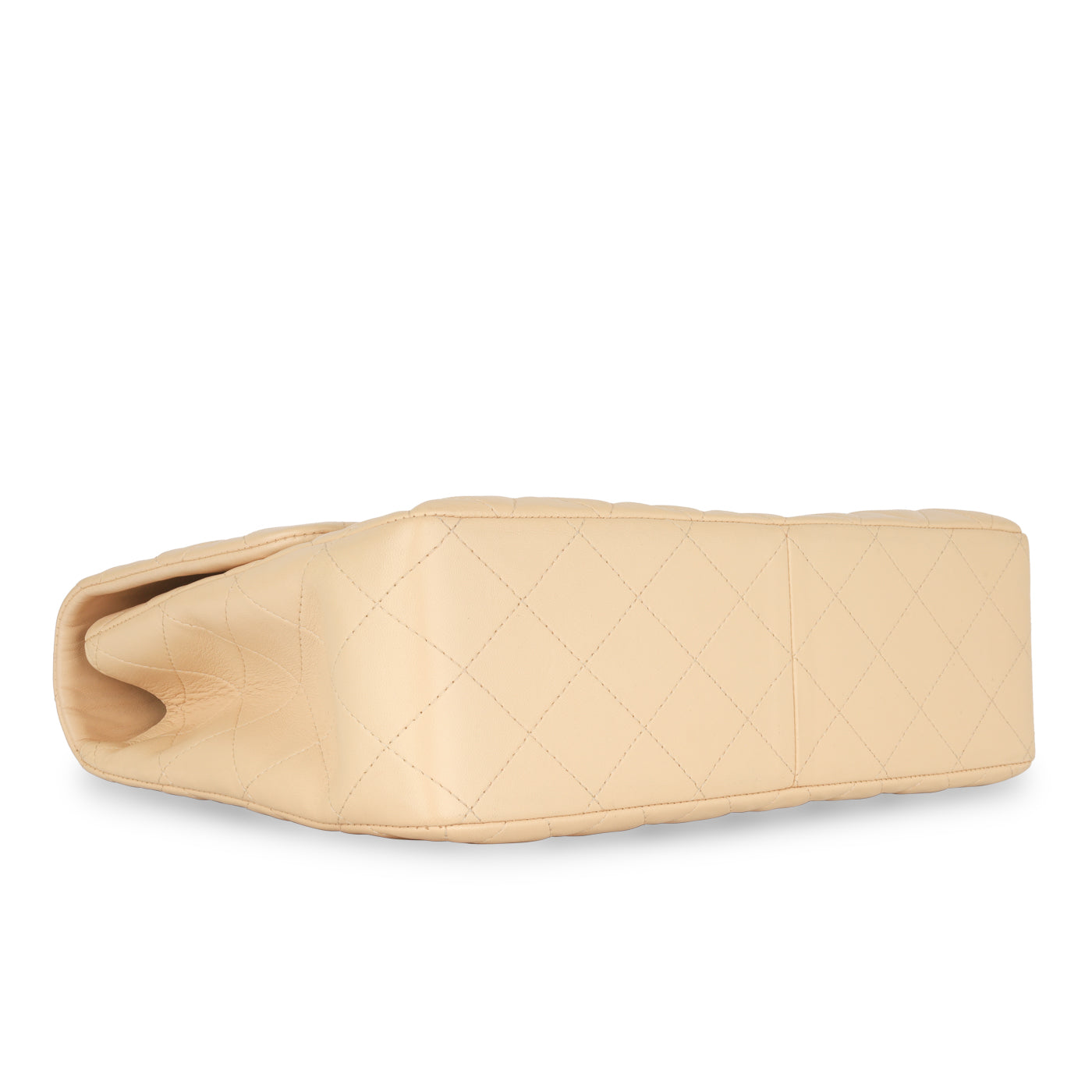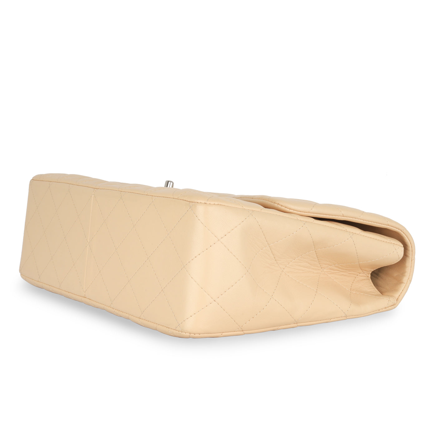 Under the creative direction of Karl Lagerfeld, Chanel continues with its line of classic quilted bags. This enviable Jumbo Flap bag Bag is crafted in beige lambskin leather, and detailed with fine stitching and silver hardware. The chain is interwoven with leather and can be worn on either a single shoulder strap or doubled up.