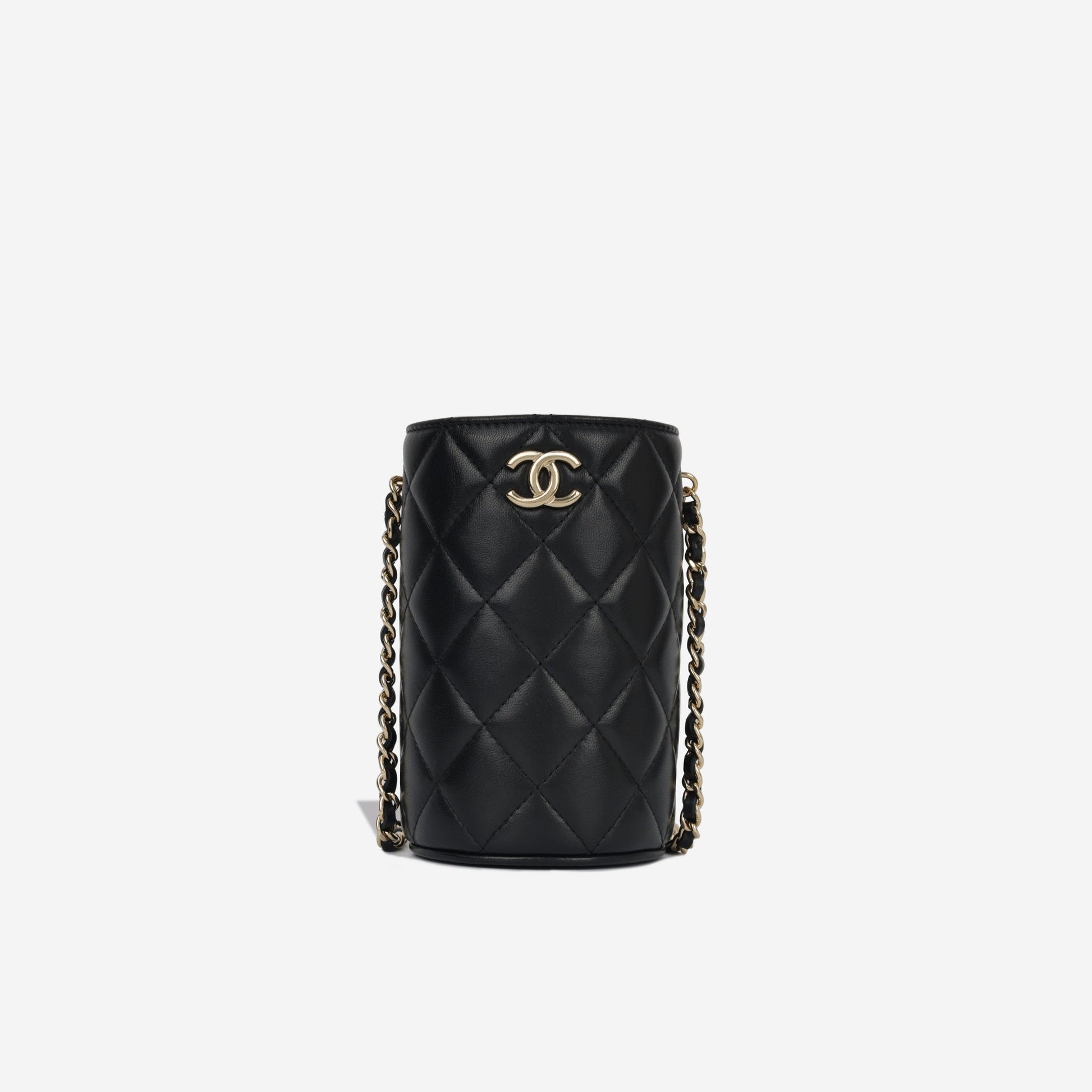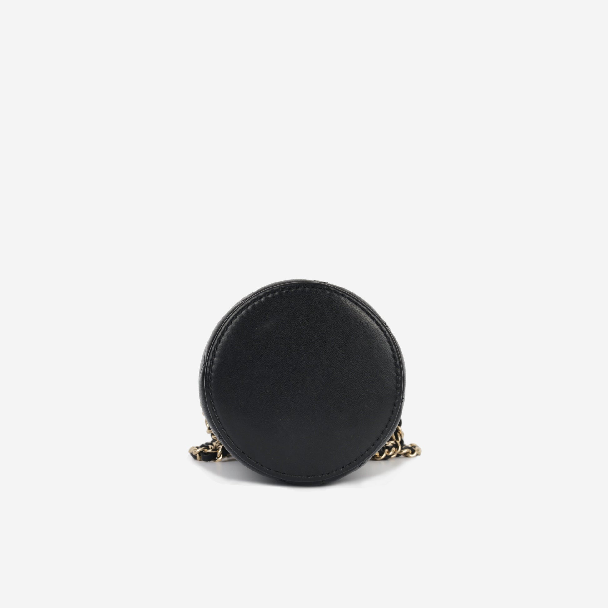 Primarily developed for storing your tiny beauty essentials and other small necessities, the vanity case has come a rather long way since its birth. With the “mini bag” remaining at the forefront of fashion accessory trends, this petite piece is the farthest thing from just a functional case. This beautiful modern vertical case is crafted from black lambskin leather and complimented with champagne gold toned hardware.