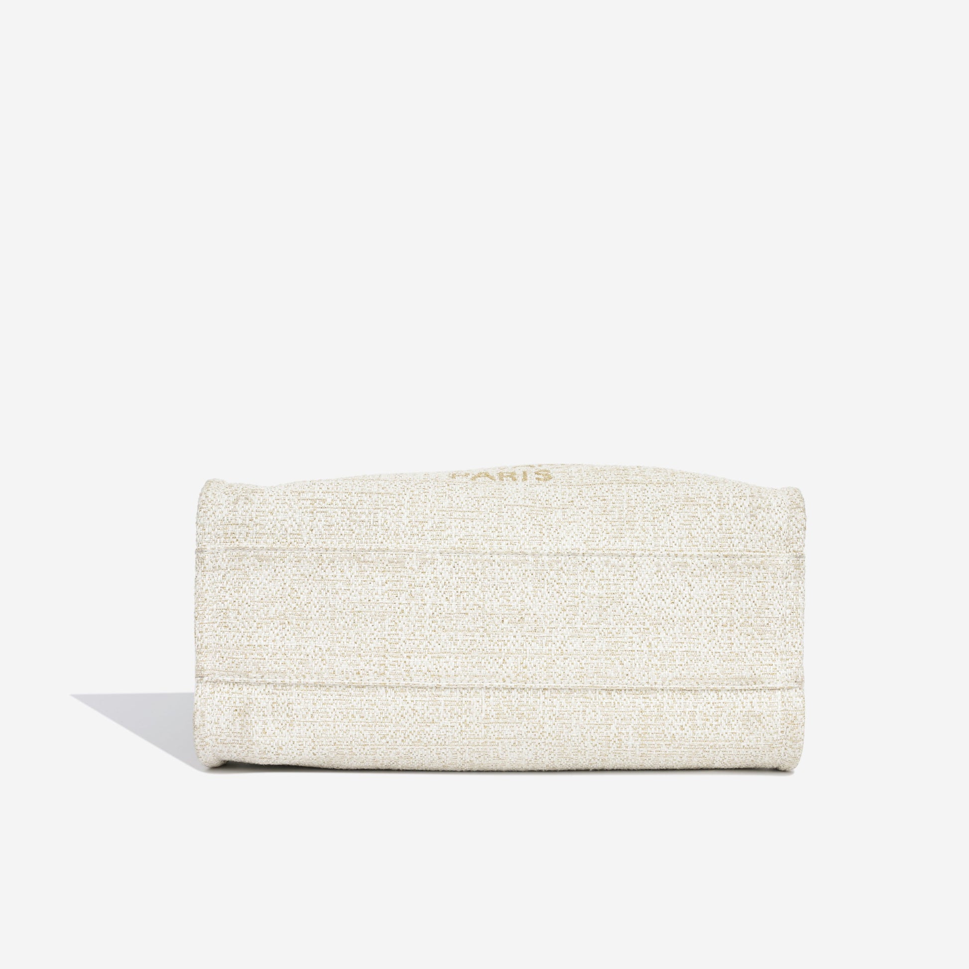 Carefully crafted from luxurious cream tweed with gold glitter leather details, the Chanel Deauville handbag is beyond stunning. Complimented by champagne tone hardware, and spacious enough to hold everything you would need throughout the day, the Deauville is suitable for travelling, a day at the beach or just running errands.