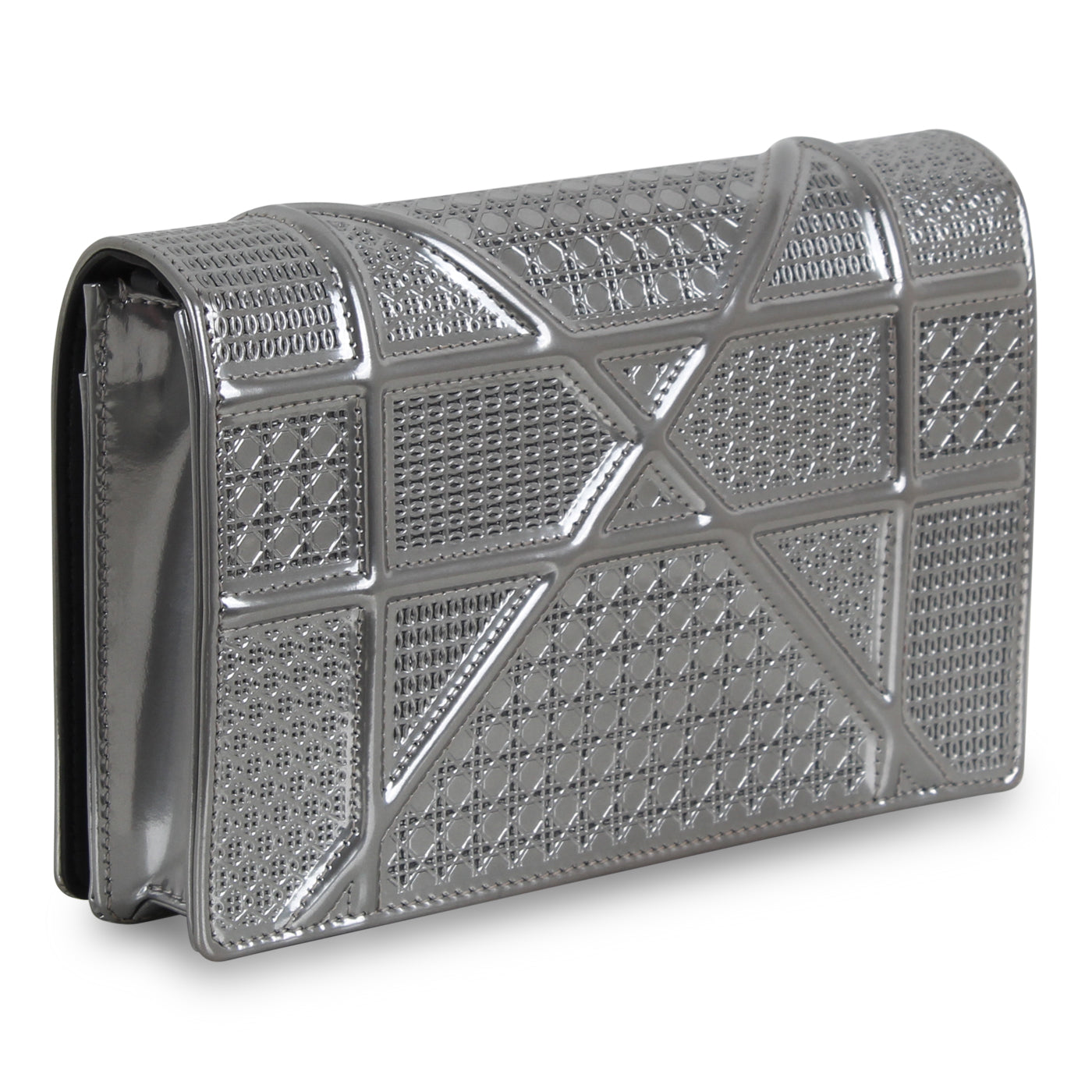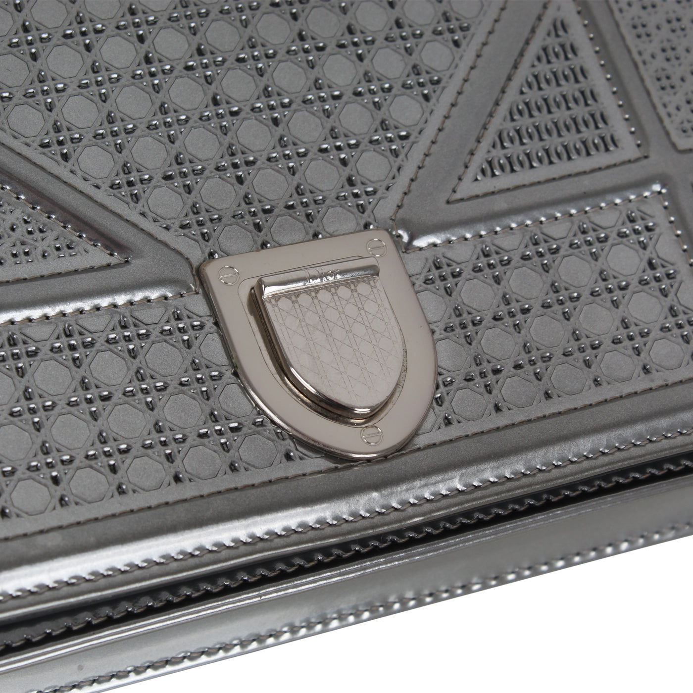 The definition of a statement piece, this Diorama is an absolute showstopper. Crafted from silver-tone metallic calfskin with an micro-cannage motif, it's difficult for heads not to turn when seeing this bag pass down the street. The Diorama has become a timeless piece from Dior's accessories line and is sure to never go out of style. The ideal complement to any outfit you may have in your wardrobe, this particular Diorama can easily take you from day to night. For the woman who wants to add a little bit of drama to her life by carrying some shimmer with her wherever she goes, this Diorama is a well worthy addition to any luxury handbag collection. A trust must have for any lover of timeless pieces and a special spot for Dior.