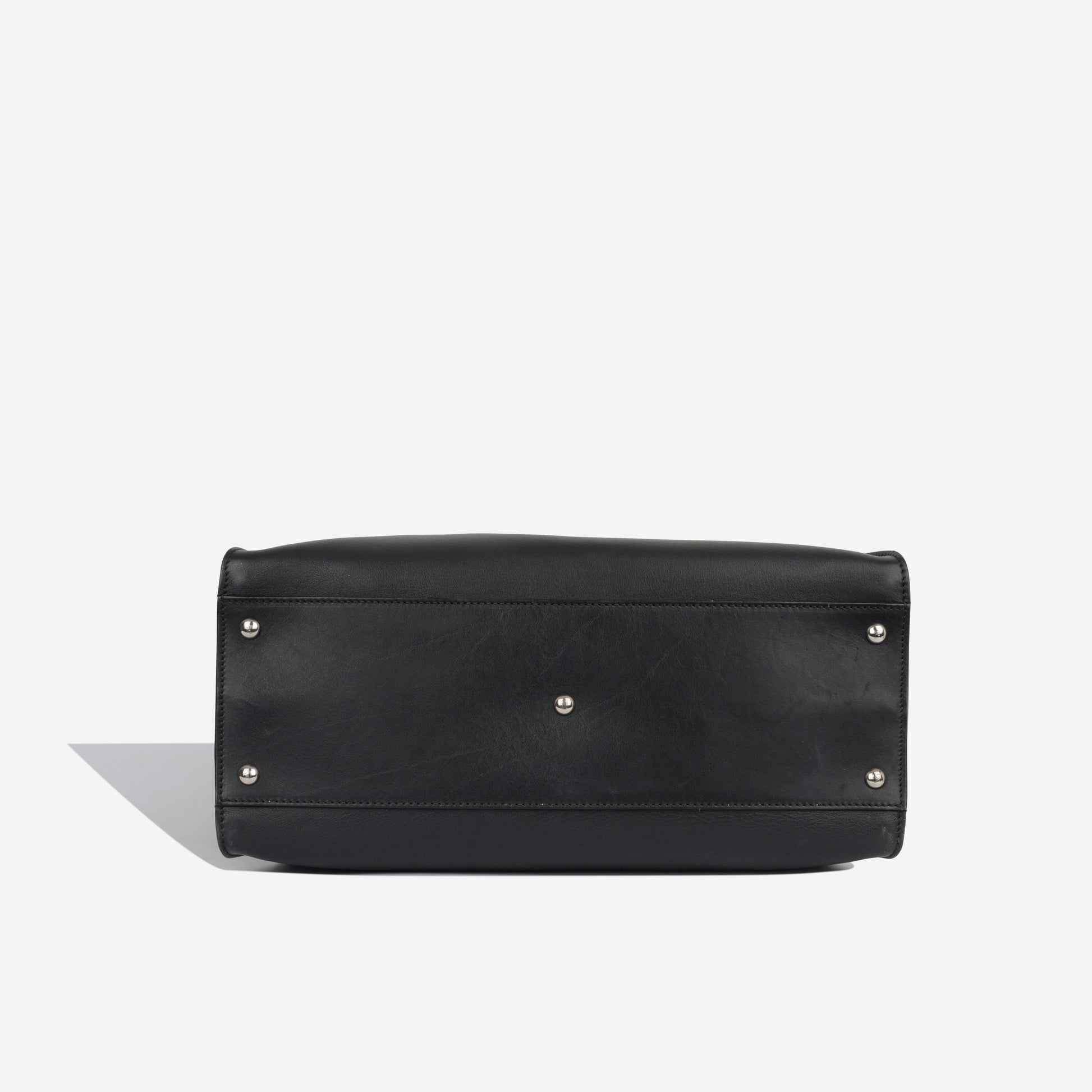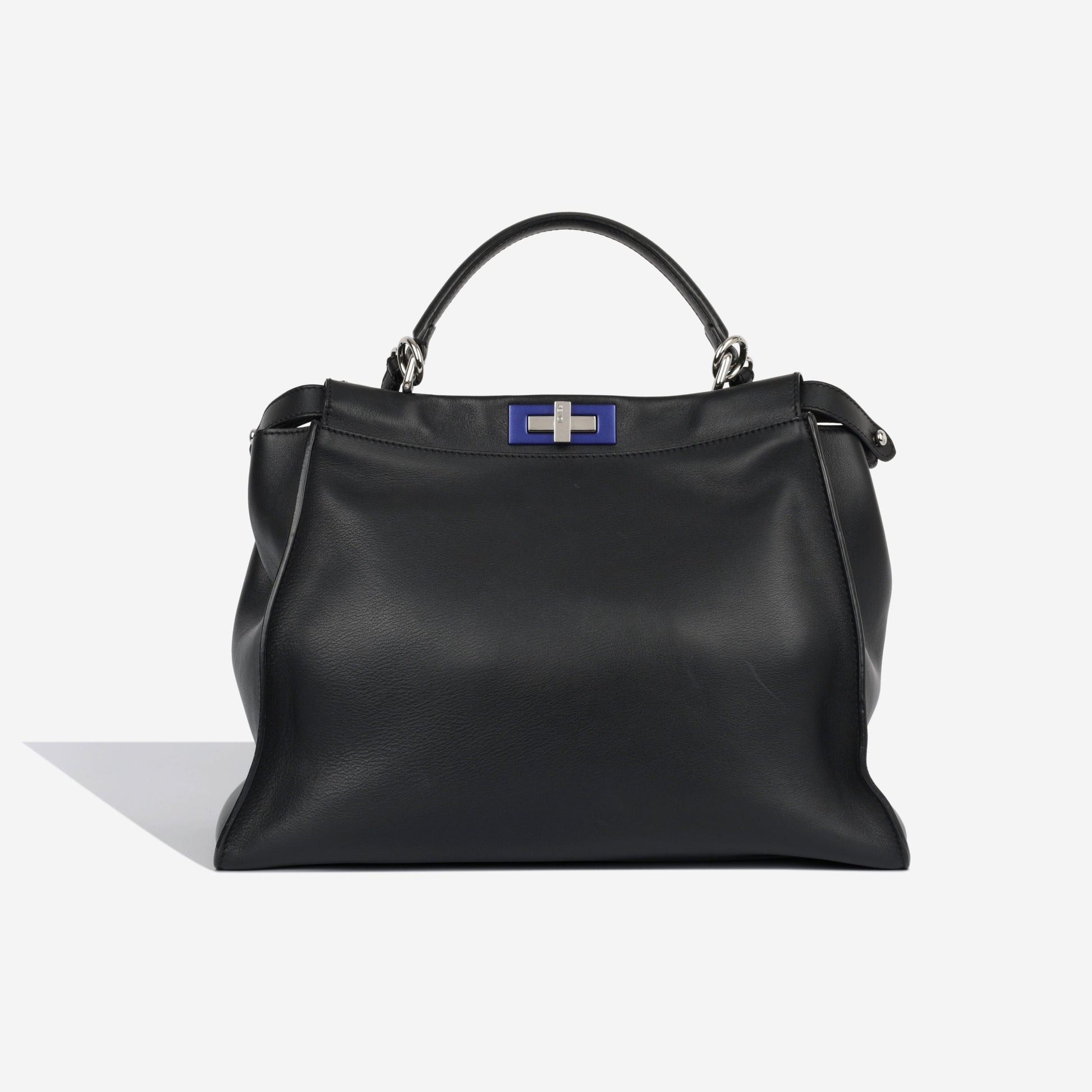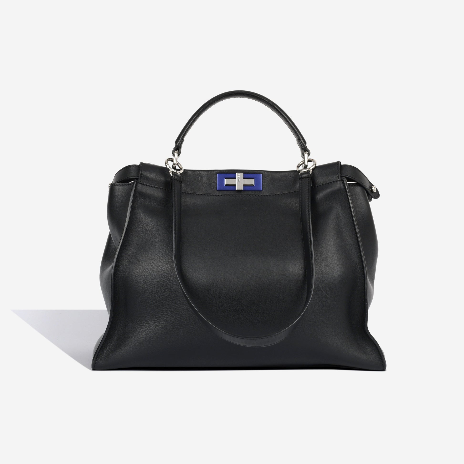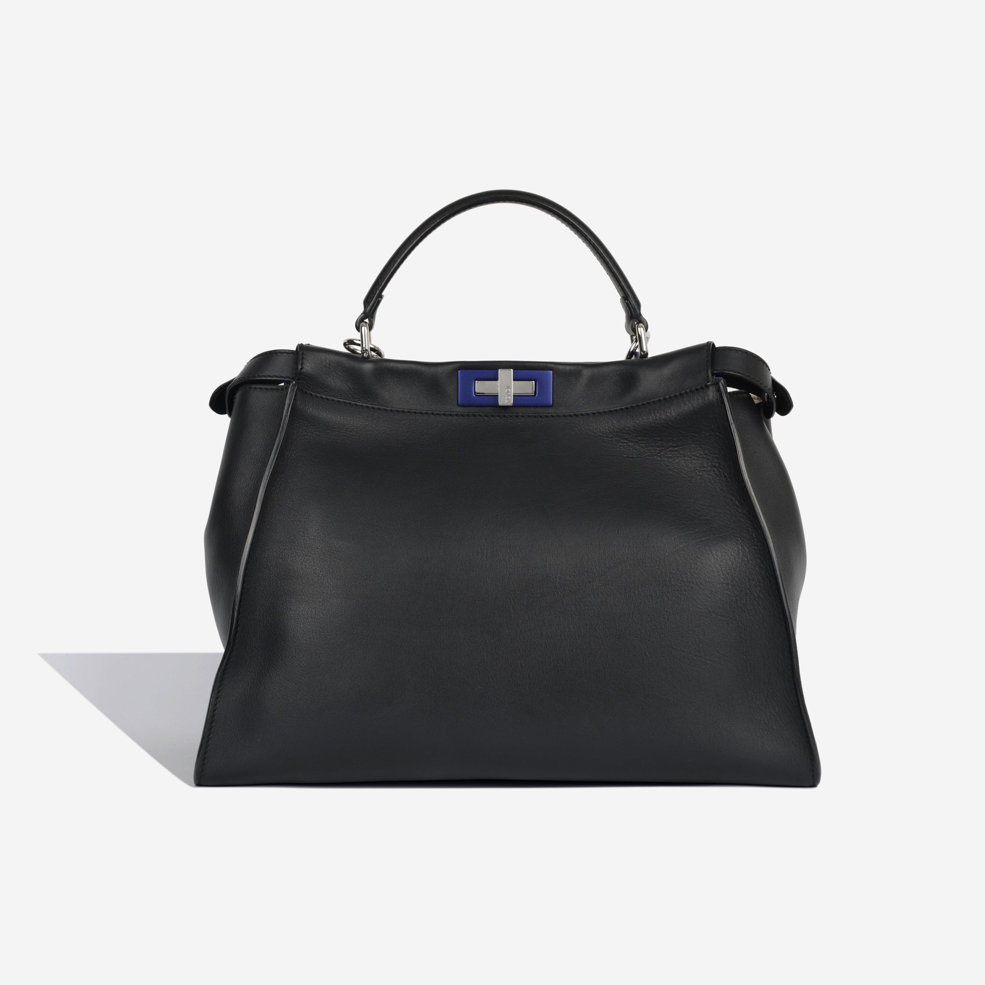 Fendi presents its iconic Peekaboo bag with smooth black calfskin leather and a pop of blue tone hardware. This bag is the perfect option for a modern, sleek woman on the go who needs to carry a lot with them. With two interior compartments divided by a stiff partition, an interior zip pocket, as well as the signature twist clasp - the Peekaboo is stylish, sophisticated, and elegant.