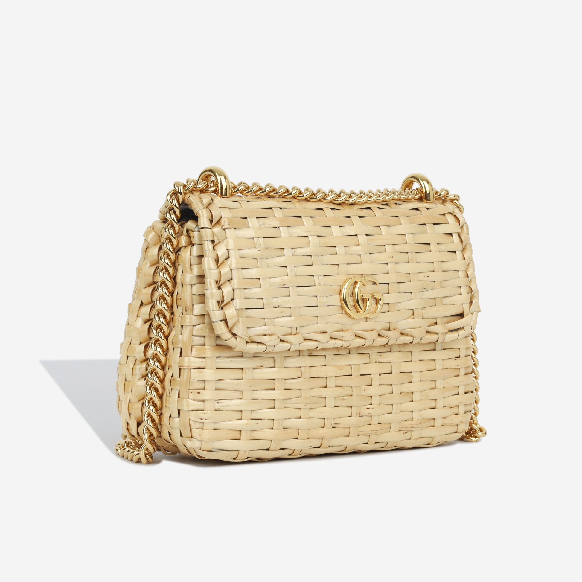 The Gucci Linea Cestino bag has a structured box like shape and created out of wicker weaving. An ideal piece for Spring and Summer in 2023, this bag is petite, sweet and versatile. The bag has expanding sides for ease when opening the bag, along with a gold chain for wearing across the body.�