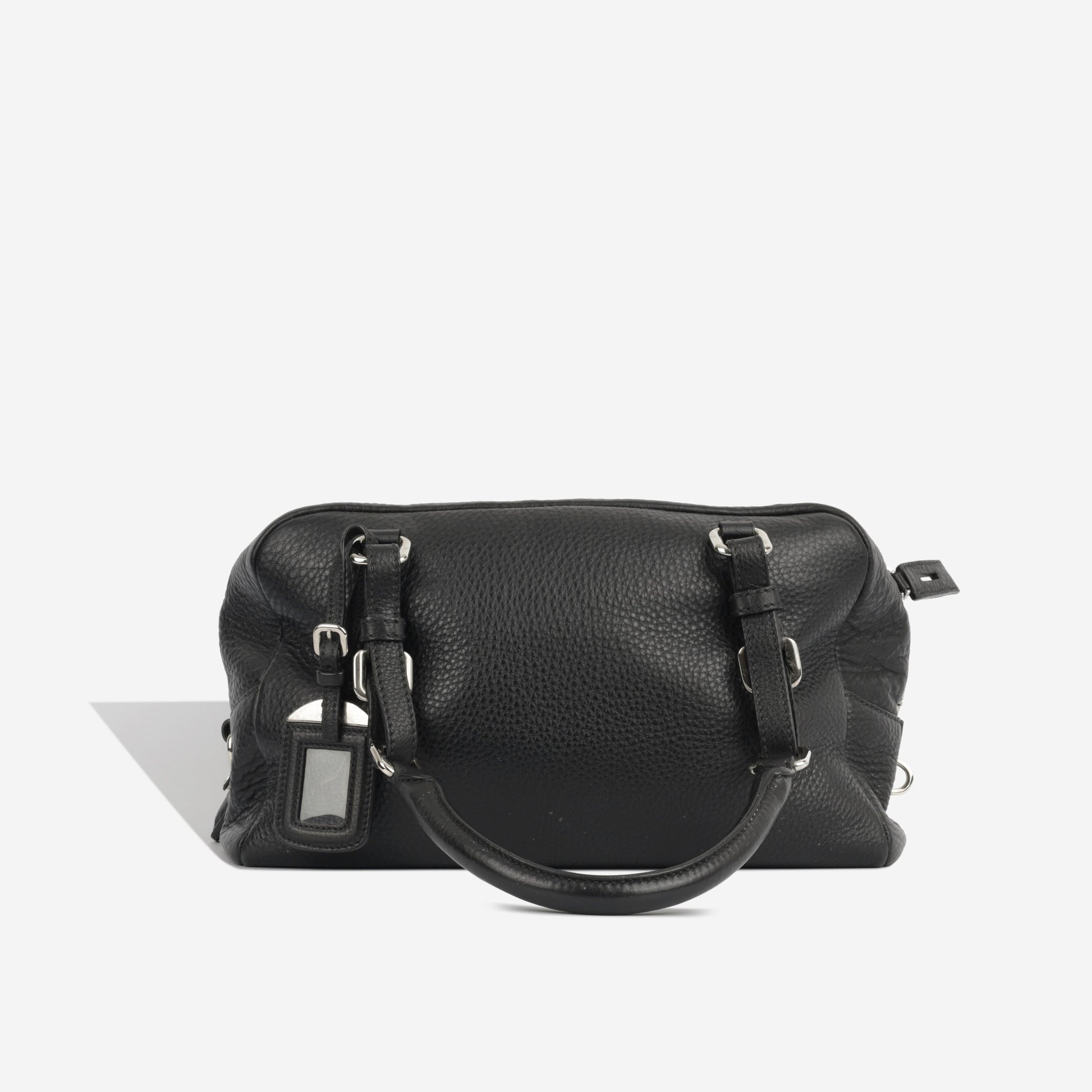 This bowling bag from Prada carries the classic enlarged logo on the front, and is crafted from black pebbled leather with silver hardware detailing. It's the perfect size to carry around with you day to day from work, to out with your friends. This bag has a slouchy appearance making it relaxed and easy to wear.