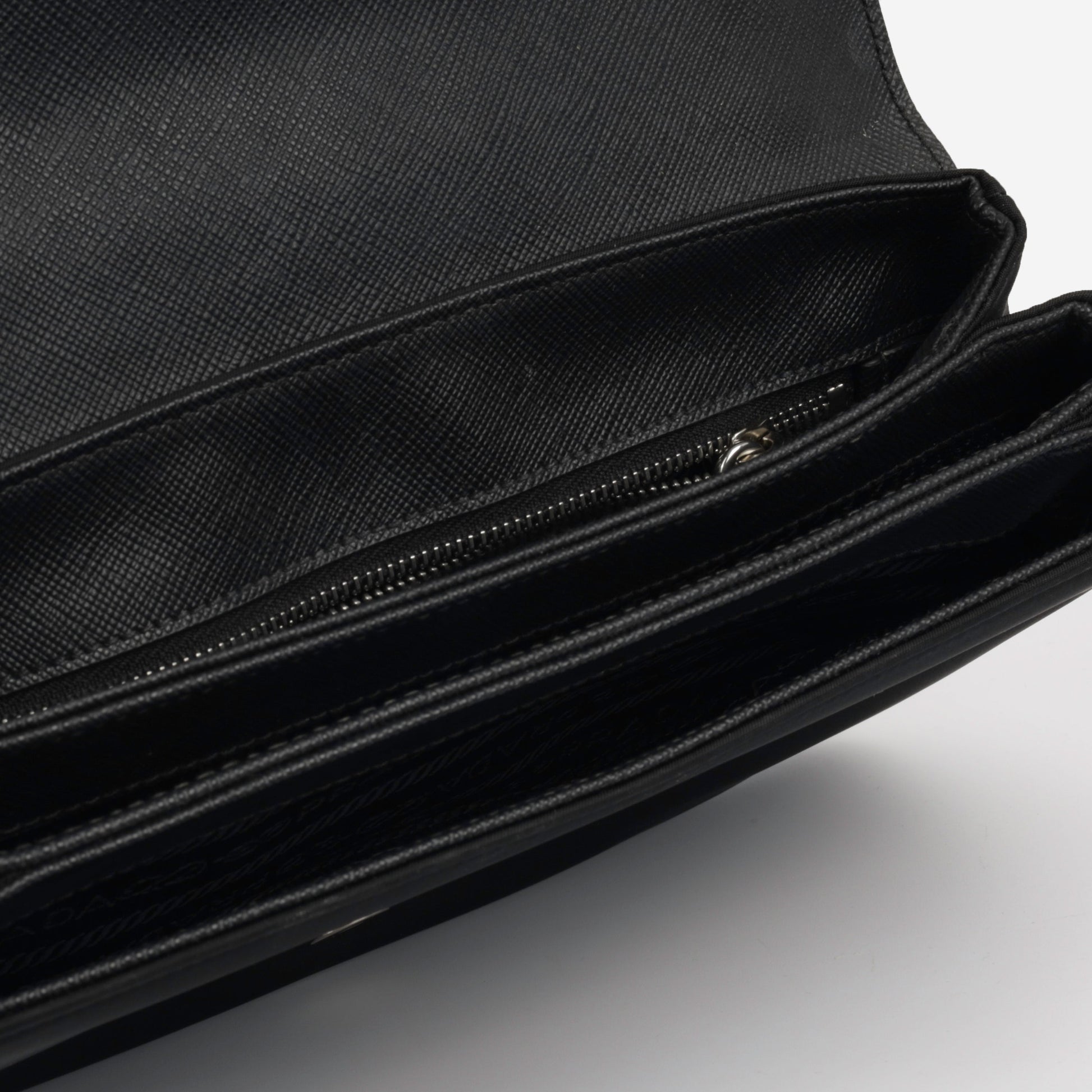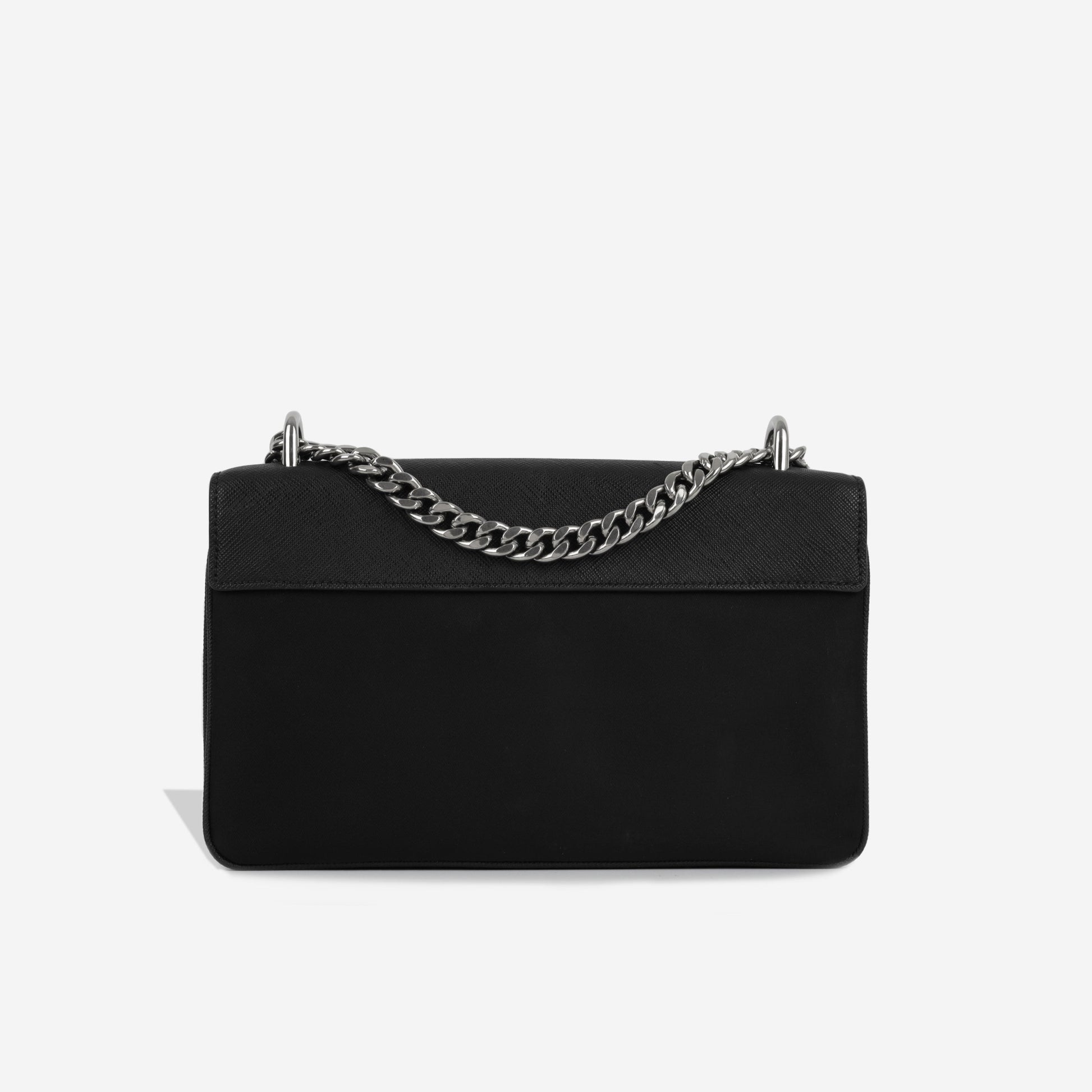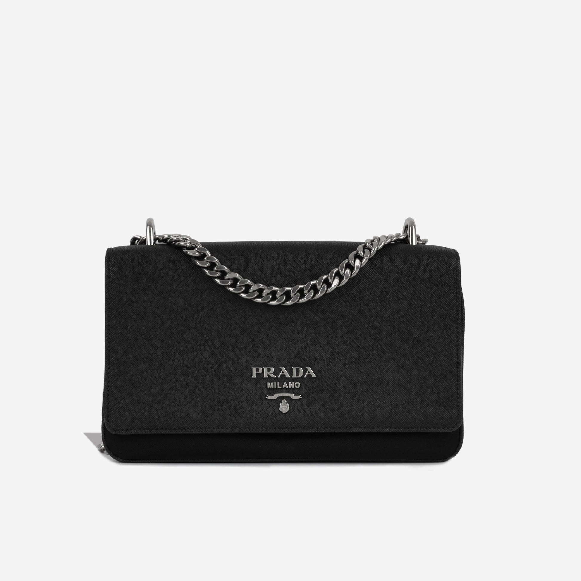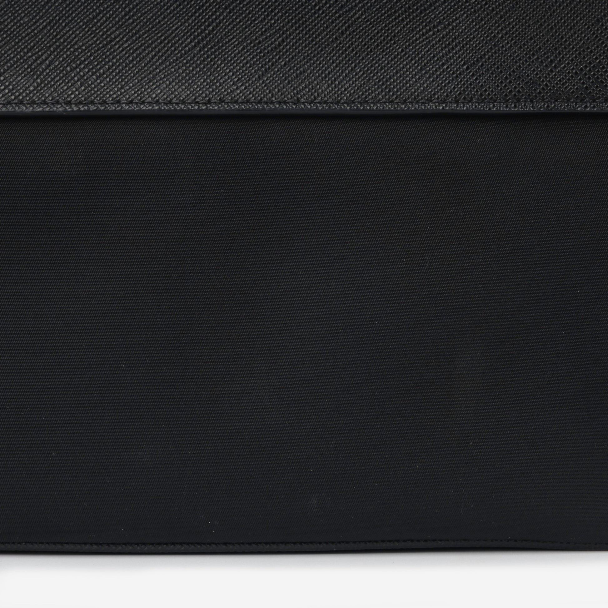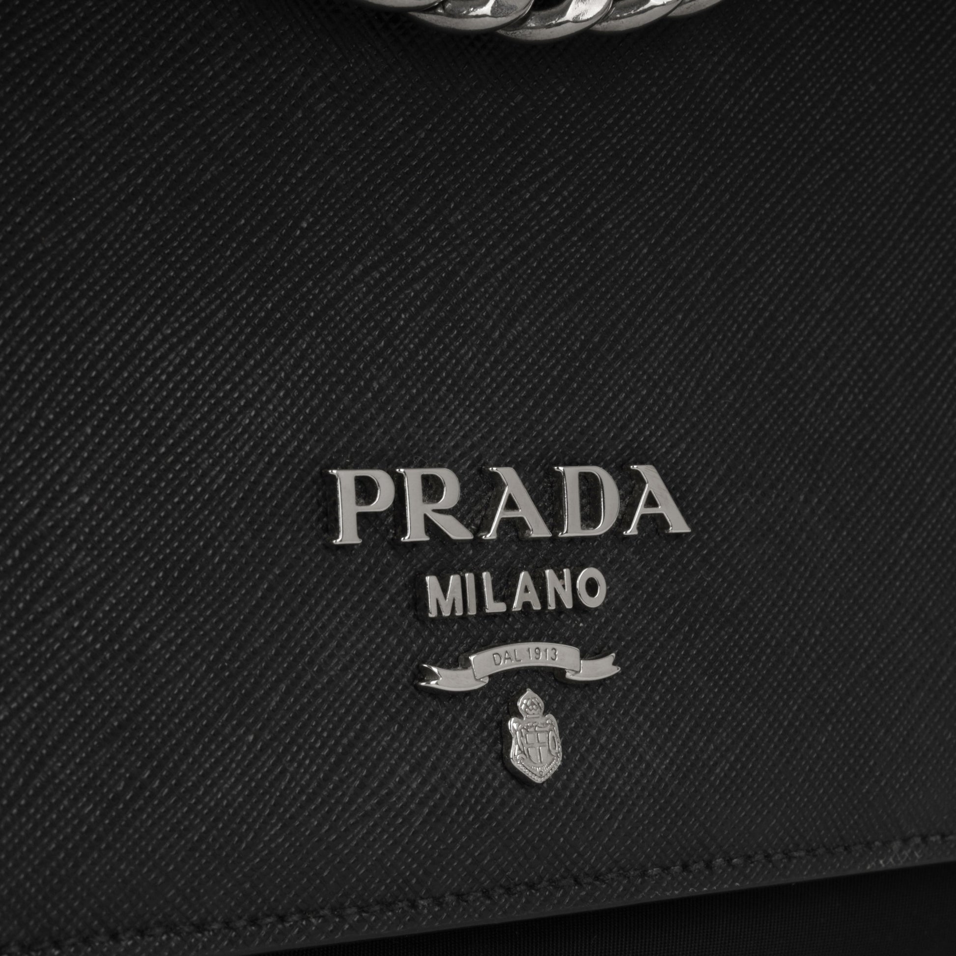 Prada presents their stunning cross body bag in a combination of their iconic materials. With a long, black leather strap and prominent gold tone logo, this bag is the ideal piece to carry you from day to night. Dress this mini bag up with a cocktail dress and a pair of heels, or dress it down with a pair of jeans and a simple top for a more casual look.