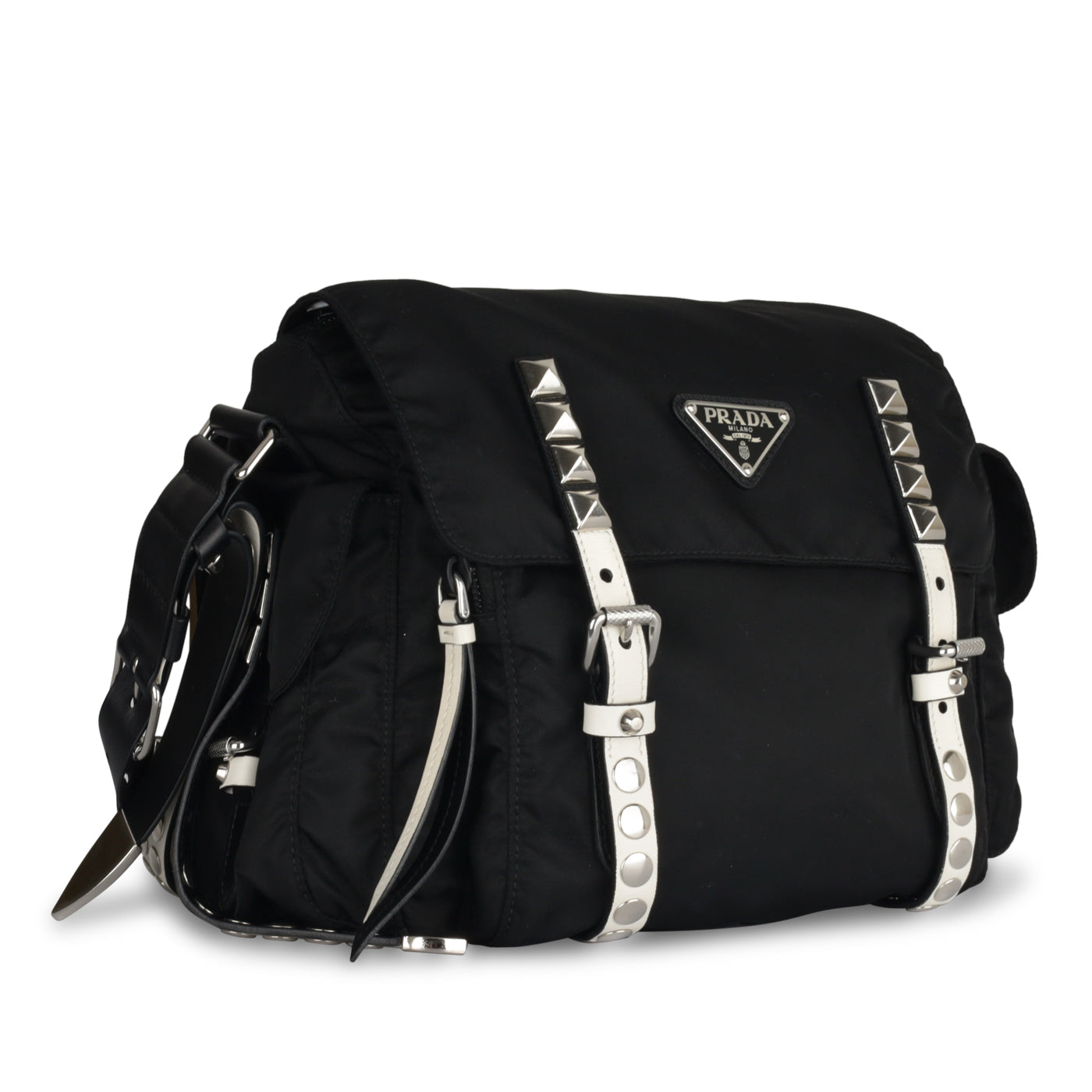 This messenger bag from Prada is for the cool woman who loves high fashion and an statement sense of style. The nylon is classic to Prada's aesthetic, and the stud detail adds a grungy statement to the outfit. This piece is edgy, versatile and perfect to take with you every day.