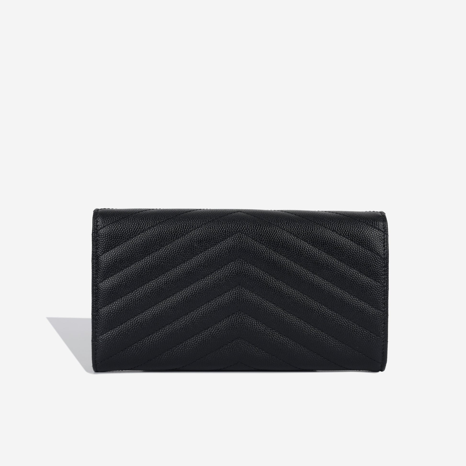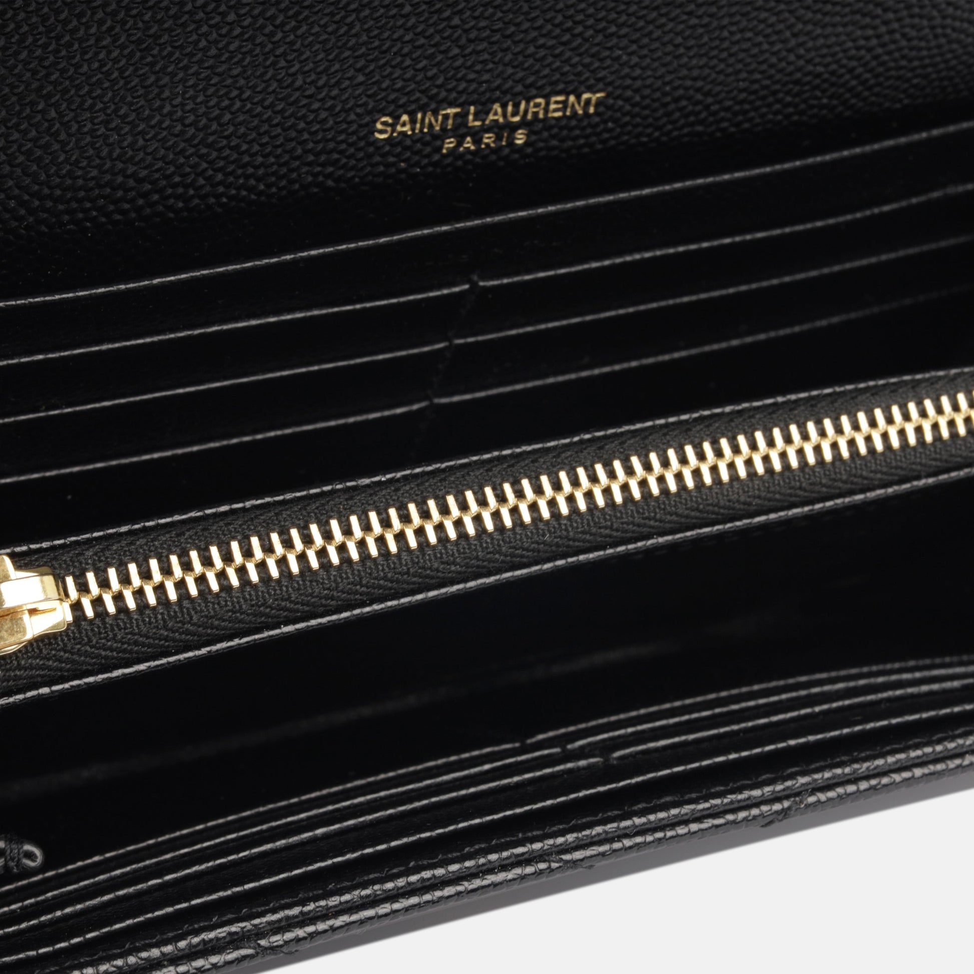 Crafted from black grained chevron leather, this card holder from Saint Laurent is a true must have. With the signature YSL logo in gold tone hardware, this piece is sleek, stylish and sophisticated. This card holder is the perfect piece to keep all your cards safe, in style. This little piece is a well worthy addition to any luxury handbag collection.