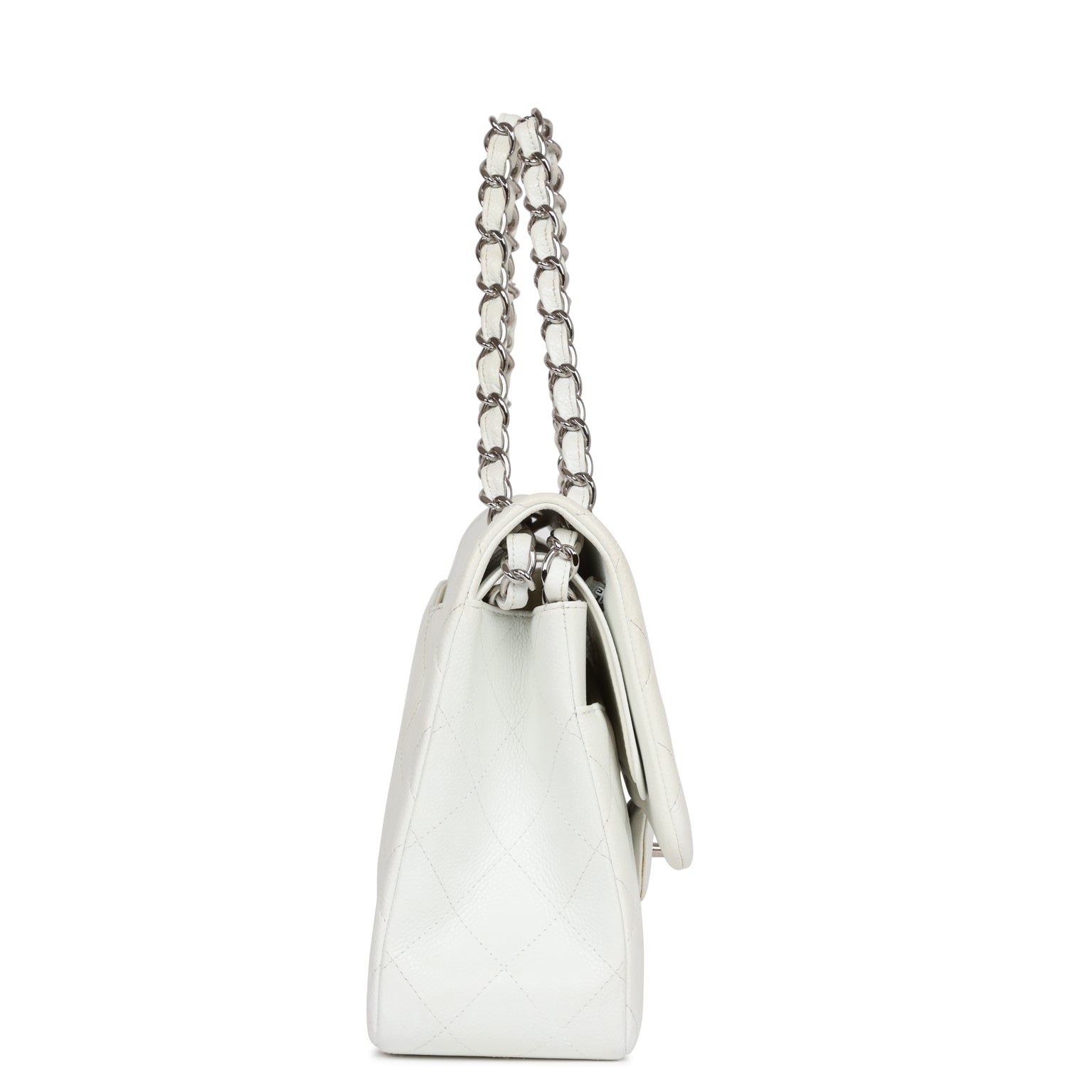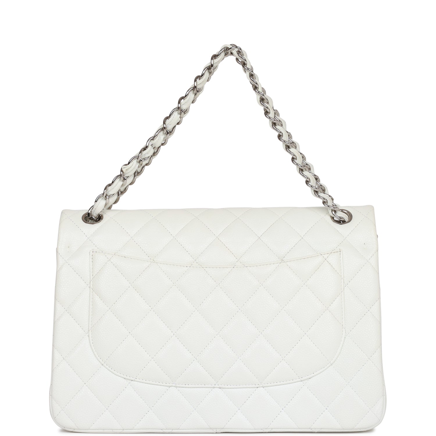 This Jumbo Classic Double Flap bag is in white caviar leather with silver tone hardware and features a front flap with signature CC turnlock closure, half moon back pocket, and adjustable interwoven silver tone chain link and white leather shoulder strap.