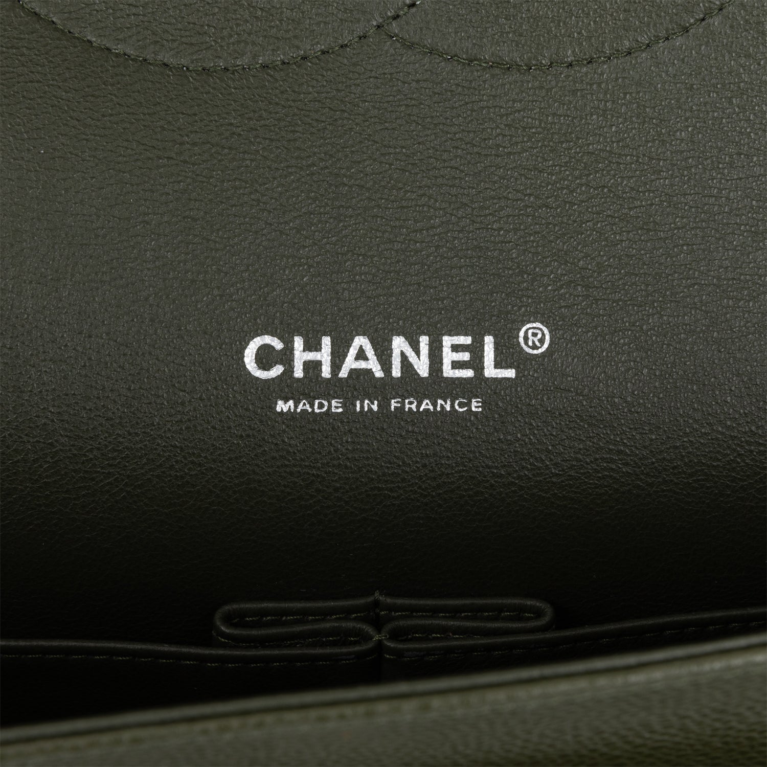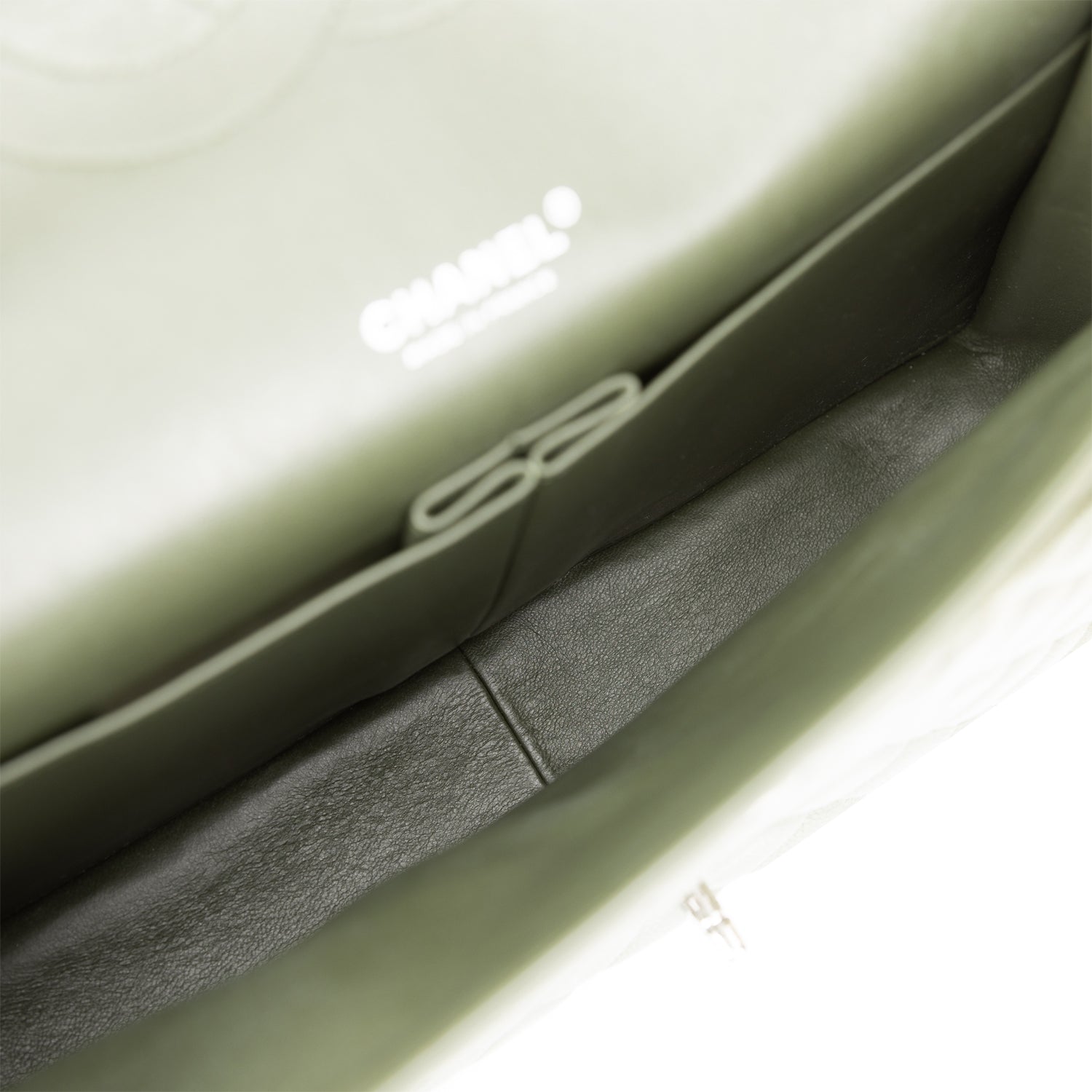 The interior is lined in dark green leather with a "love letter" zipper compartment under the first flap, an "outer" slit pocket under the second flap, and an interior compartment with two open pockets separated by a "lipstick" compartment.