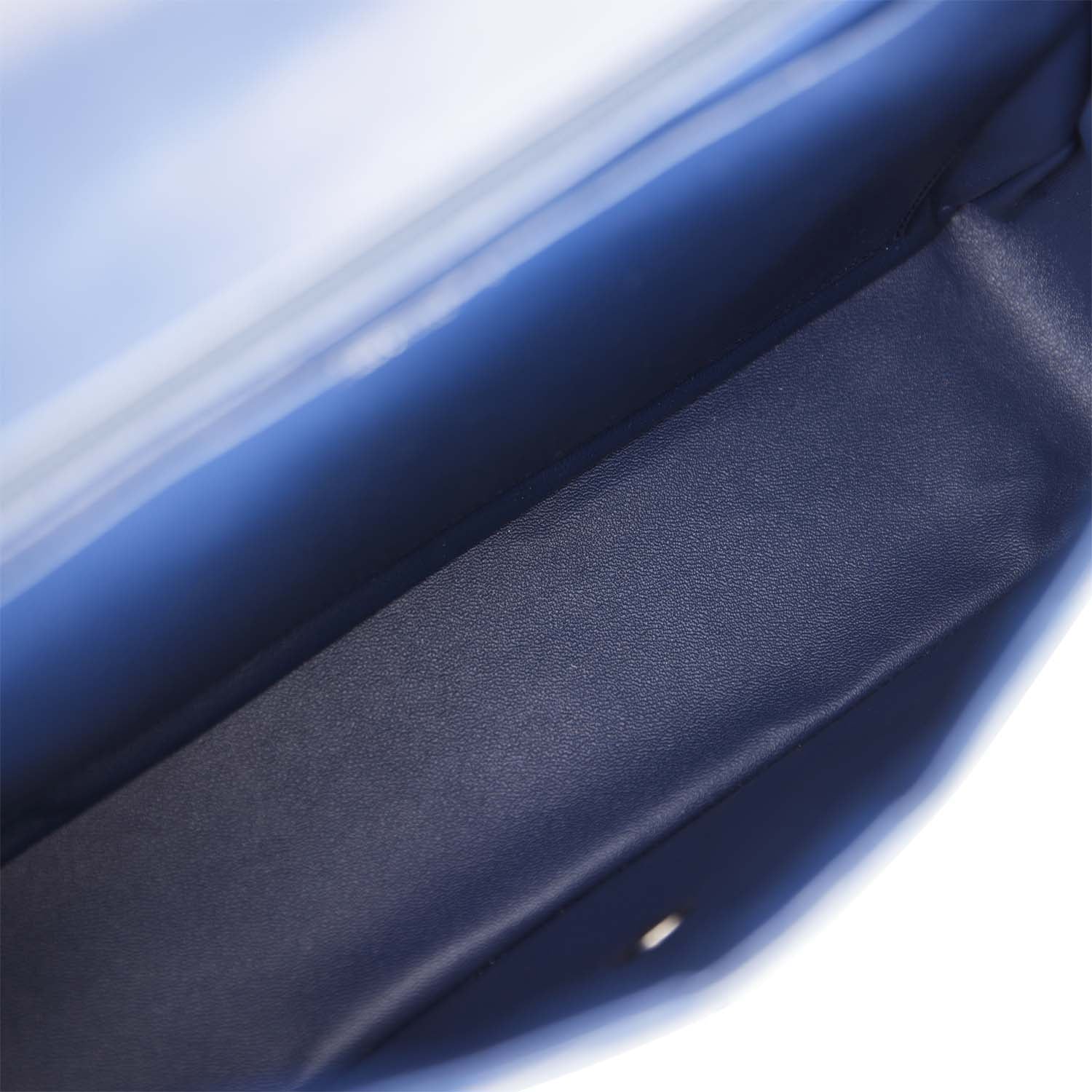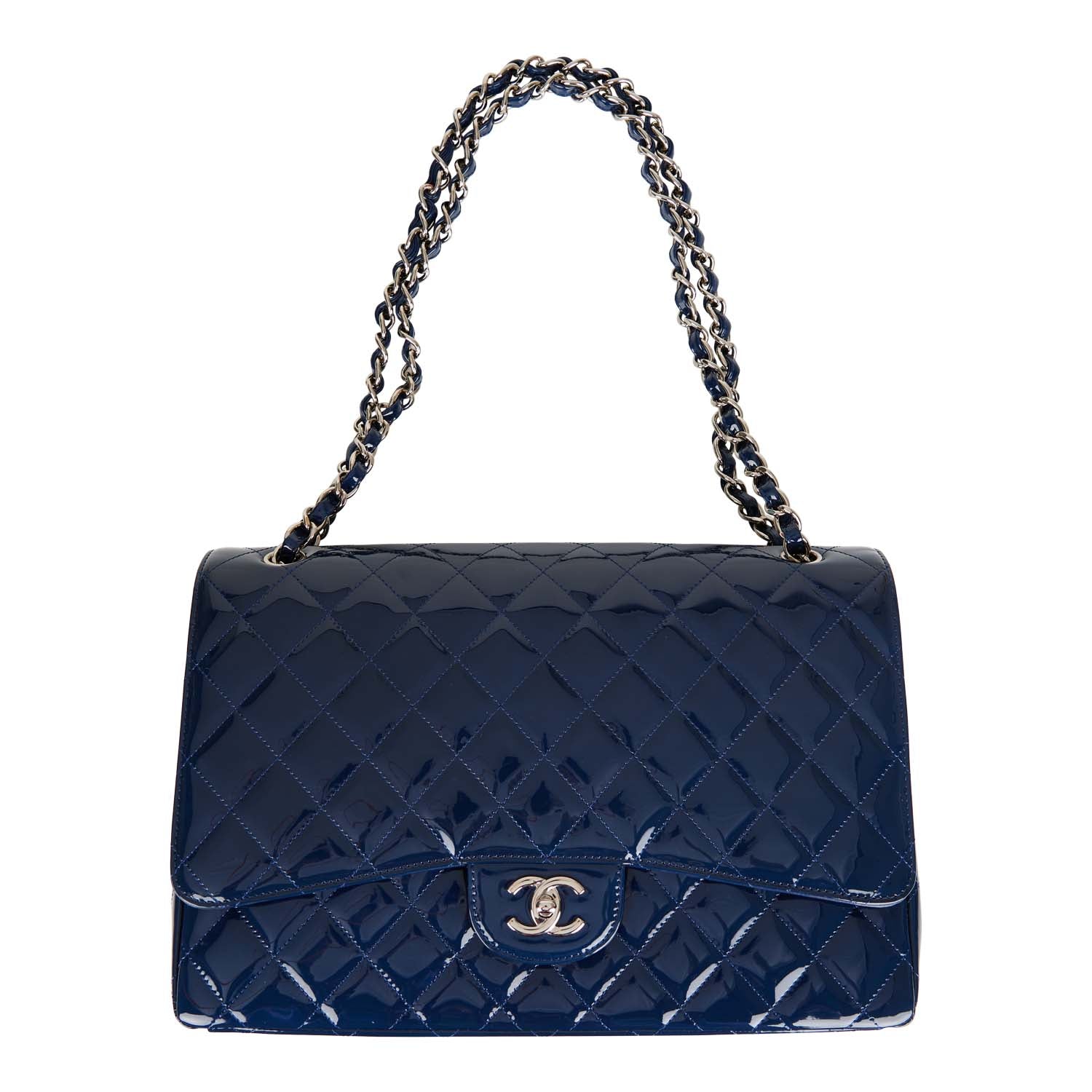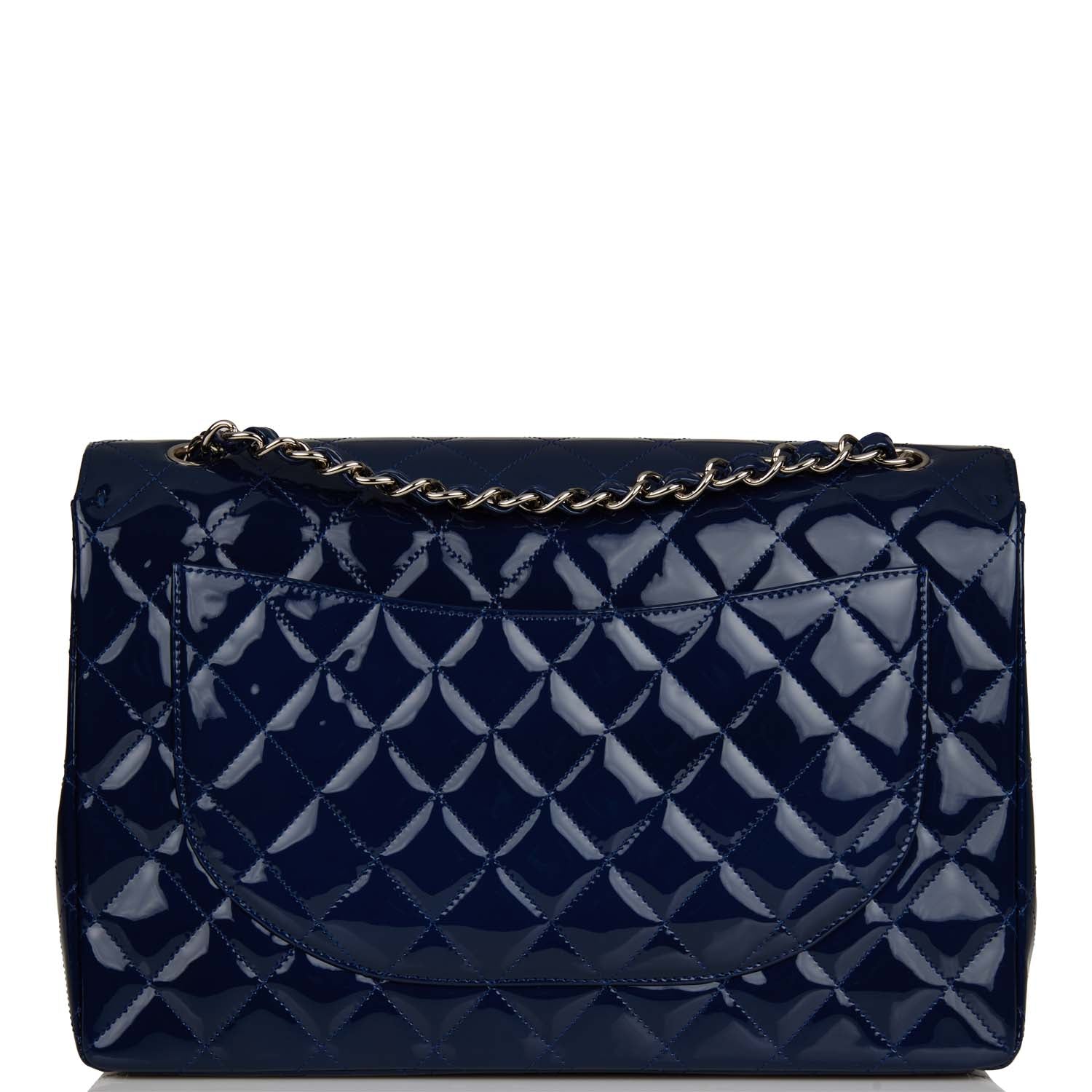 Chanel Maxi Classic Single Flap Bag Dark Blue Patent Silver Hardware