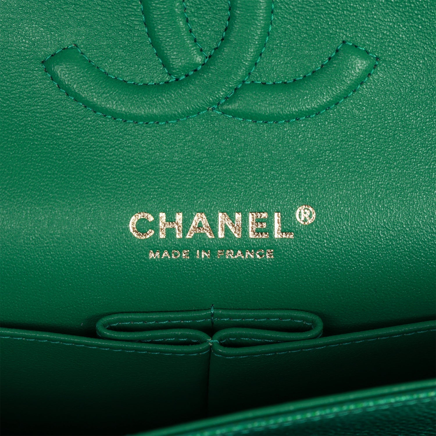 The interior is lined in green leather with the "love letter" zipper compartment underneath the first flap, an "outer" slit pocket under the second flap, and an interior compartment with two open pockets separated by a "lipstick" compartment.