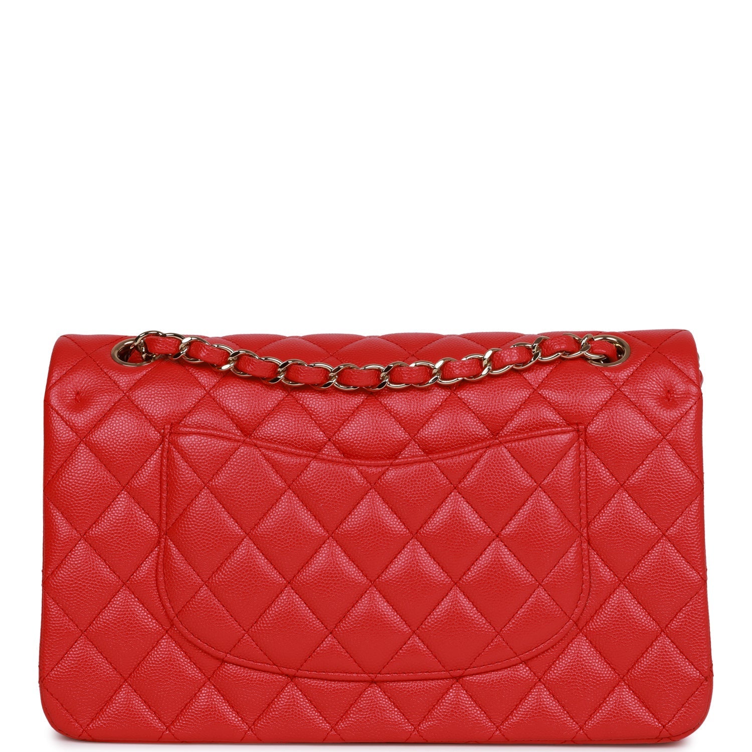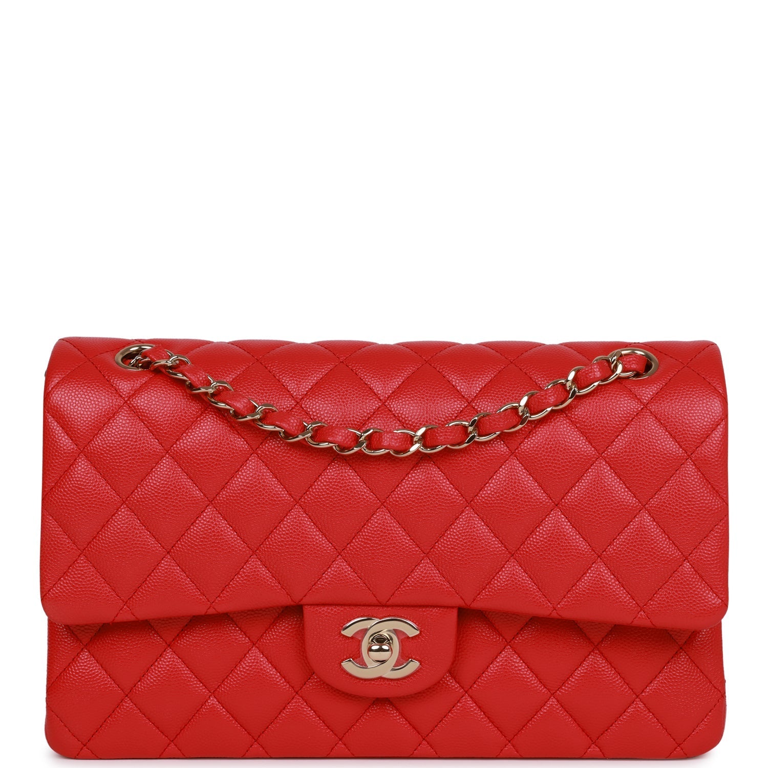 This Medium Classic Double Flap bag is in red caviar leather with light gold tone hardware and features a front flap with signature CC turnlock closure, half moon back pocket, and adjustable interwoven light gold tone chain link and red leather shoulder strap.