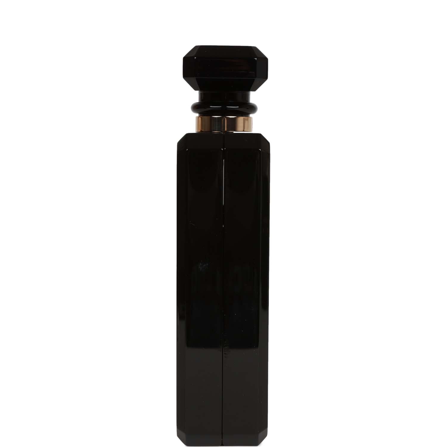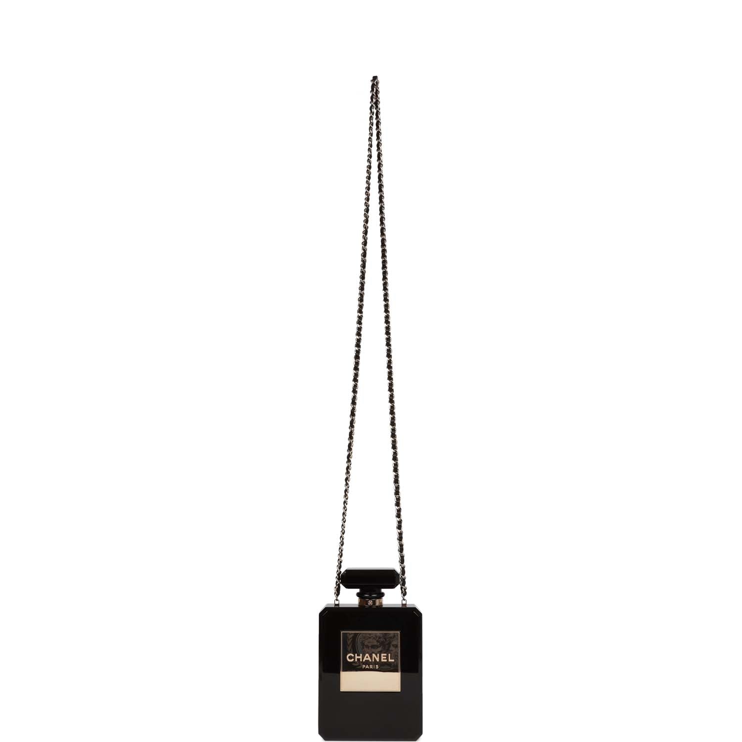 This Minaudiere clutch is in Black acrylic in the shape of a Chanel perfume bottle with light gold hardware, logo at center, a frame push down closure, and a long shoulder/crossbody strap that can be tucked away.