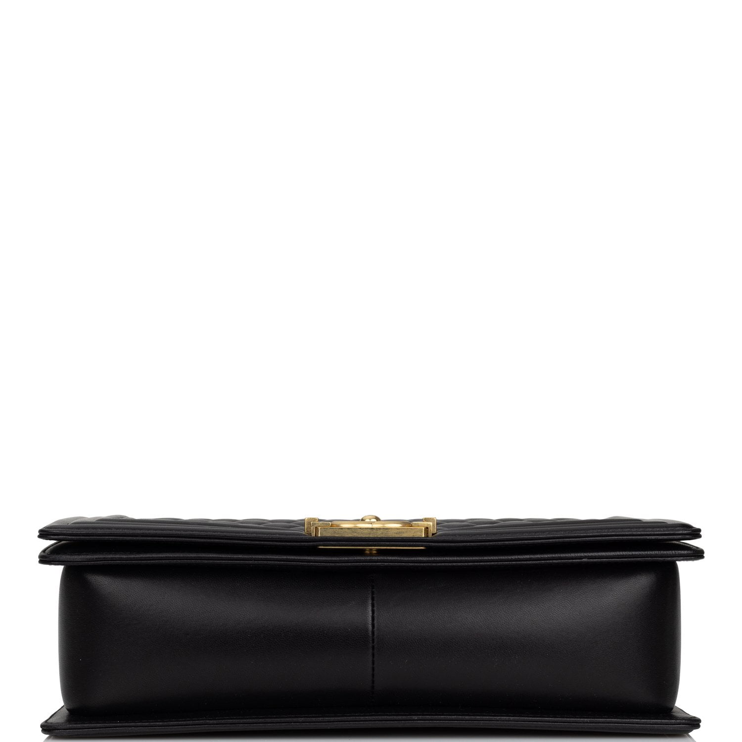 This New Medium Boy bag is in black quilted lambskin with antique gold tone hardware and features a full front flap with the Le Boy CC push lock closure and an antique gold tone chain link and black leather padded shoulder/crossbody strap.