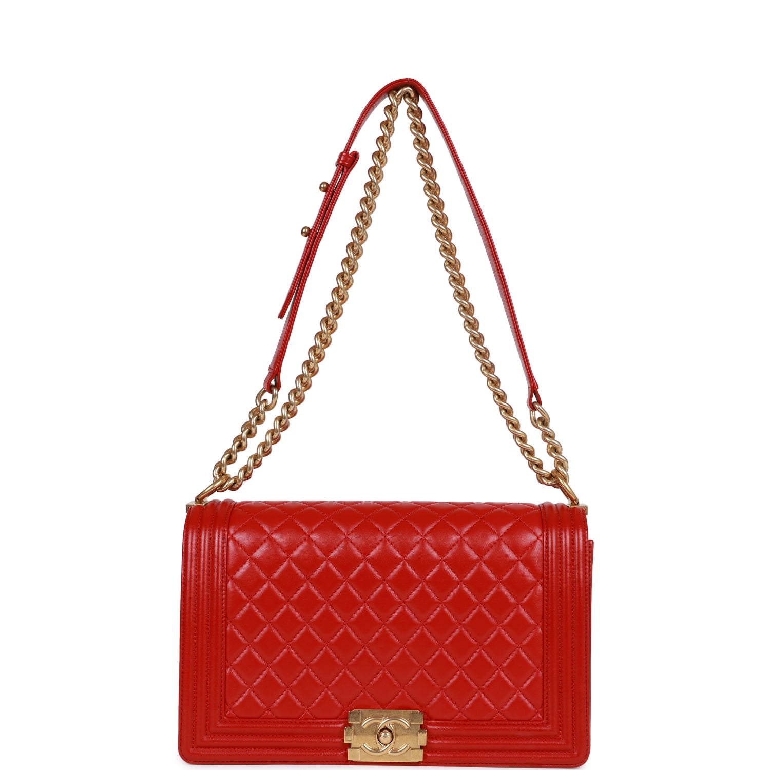This New Medium Boy bag is in red quilted lambskin with antique gold tone hardware and features a full front flap with the Le Boy CC push lock closure and an antique gold tone chain link and red leather padded shoulder/crossbody strap.