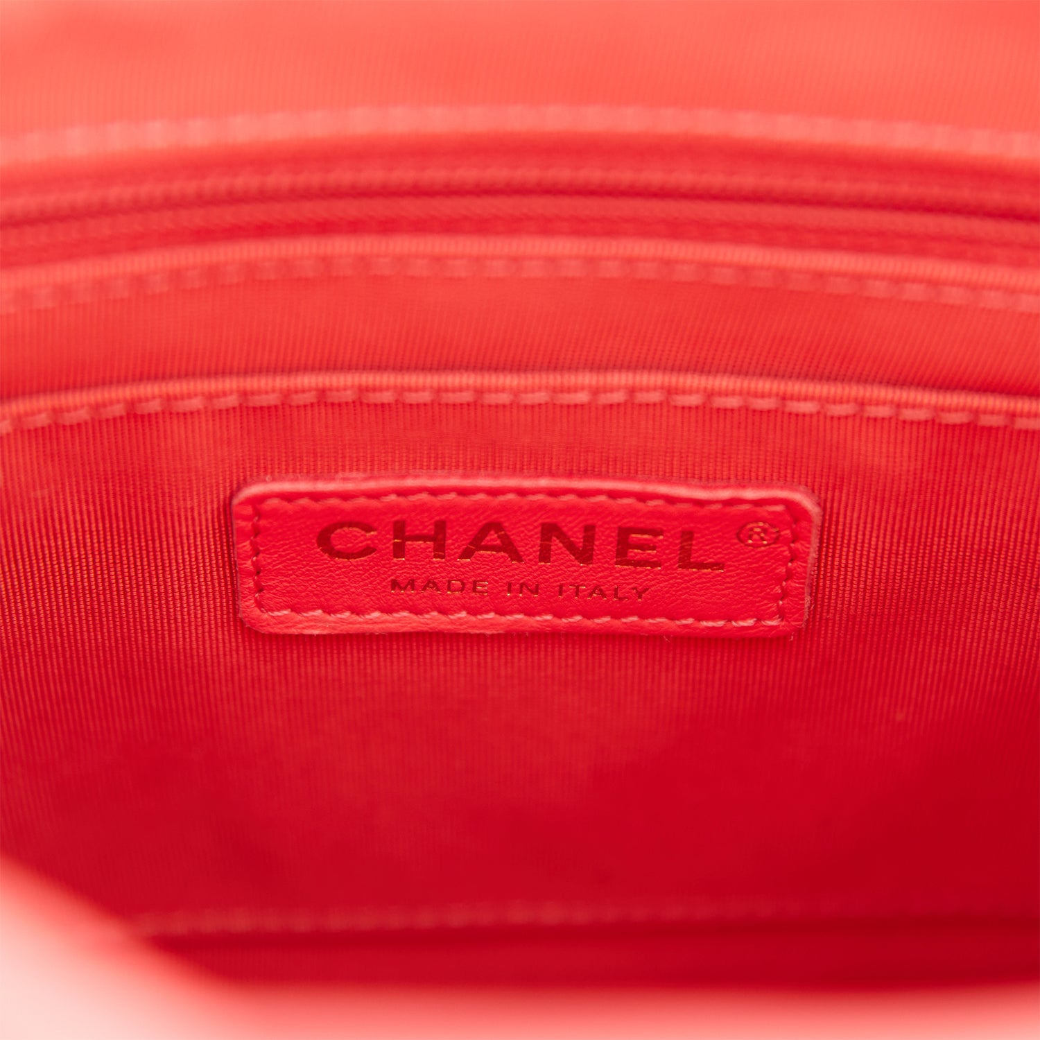 The interior is lined in rose fabric and features a zipper pocket with Chanel pull and an open pocket below.