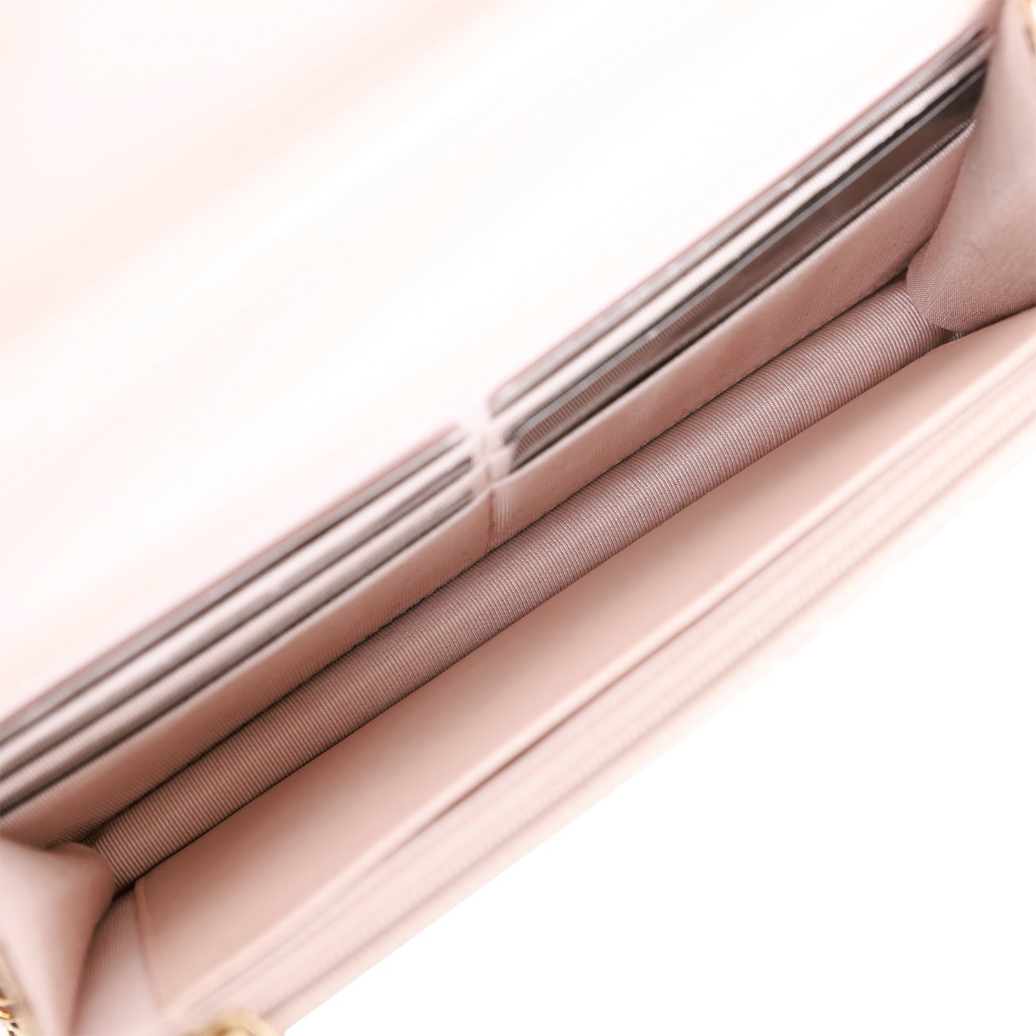 This Wallet on Chain is of gold metallic python with light gold tone hardware and has a front flap with CC emblem, half moon back pocket and long light gold tone metal and light pink leather chain.