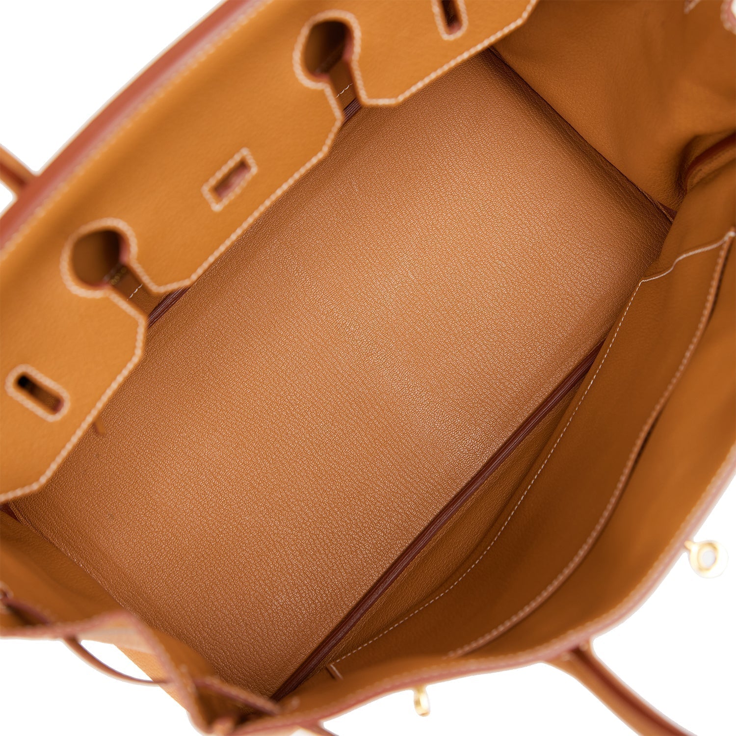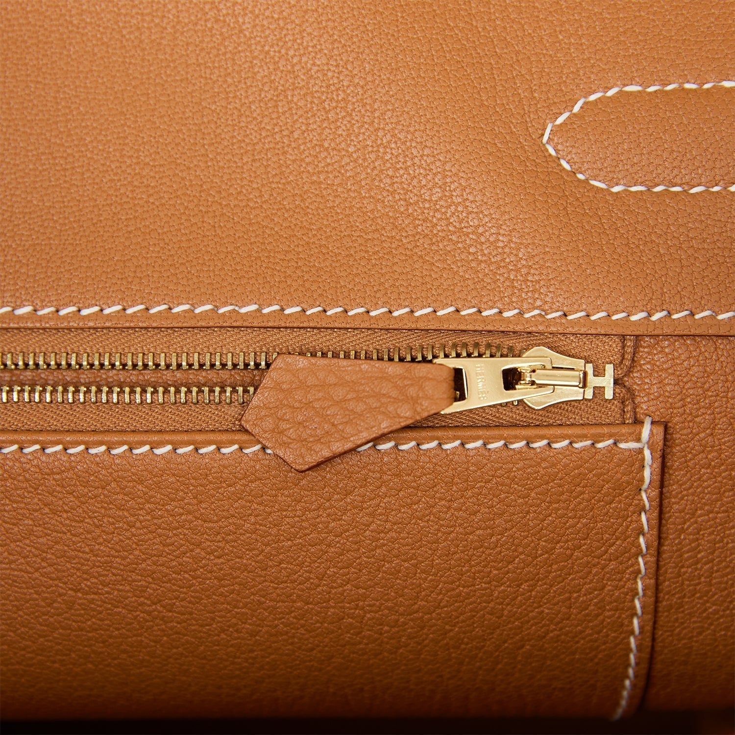 The interior is lined with gold chevre and has one zip pocket with an Hermes engraved zipper pull and an open pocket on the opposite side.