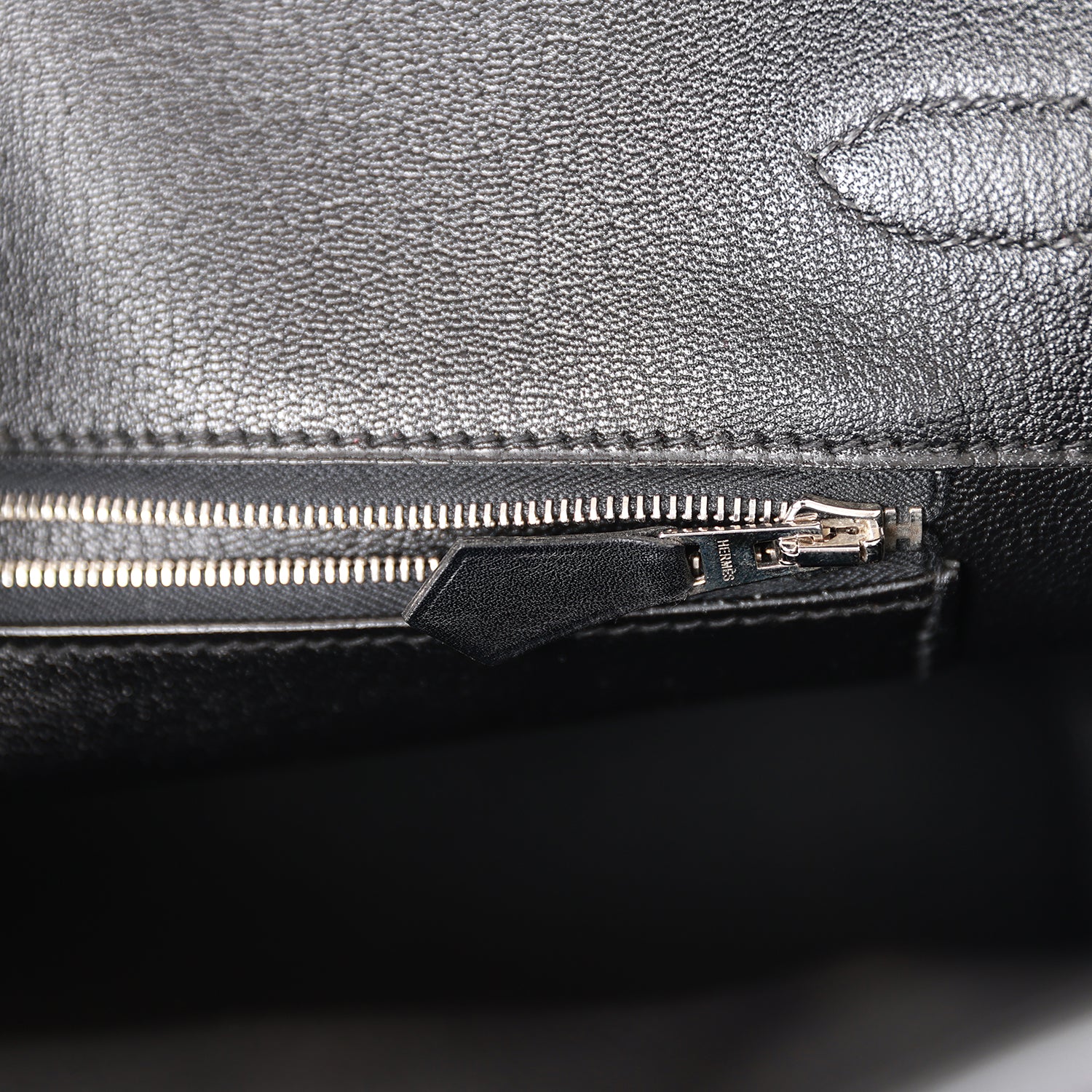 The interior is lined with black chevre and has one zip pocket with an Hermes engraved zipper pull and an open pocket on the opposite side.