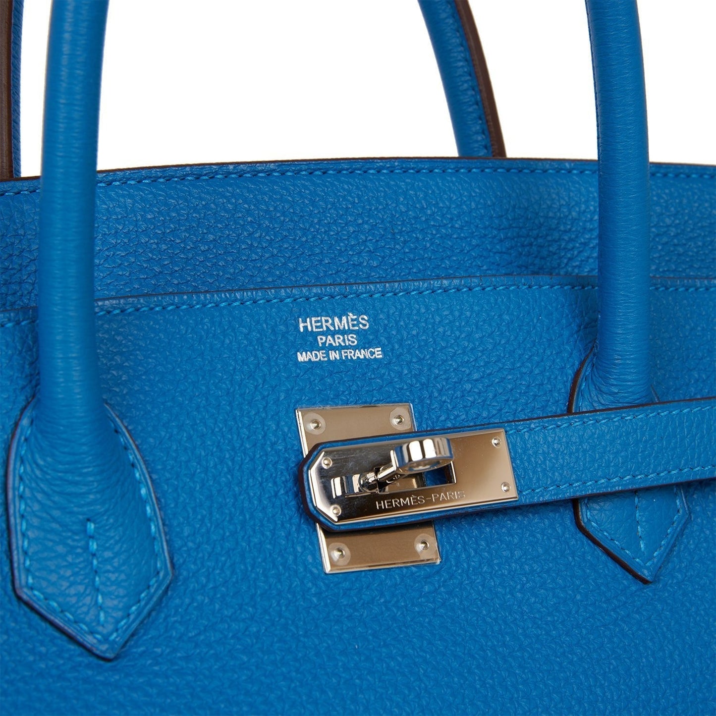 This Birkin is in Mykonos togo leather with palladium hardware and has tonal stitching, two straps with front toggle closure, clochette with lock and two keys and double rolled handles.