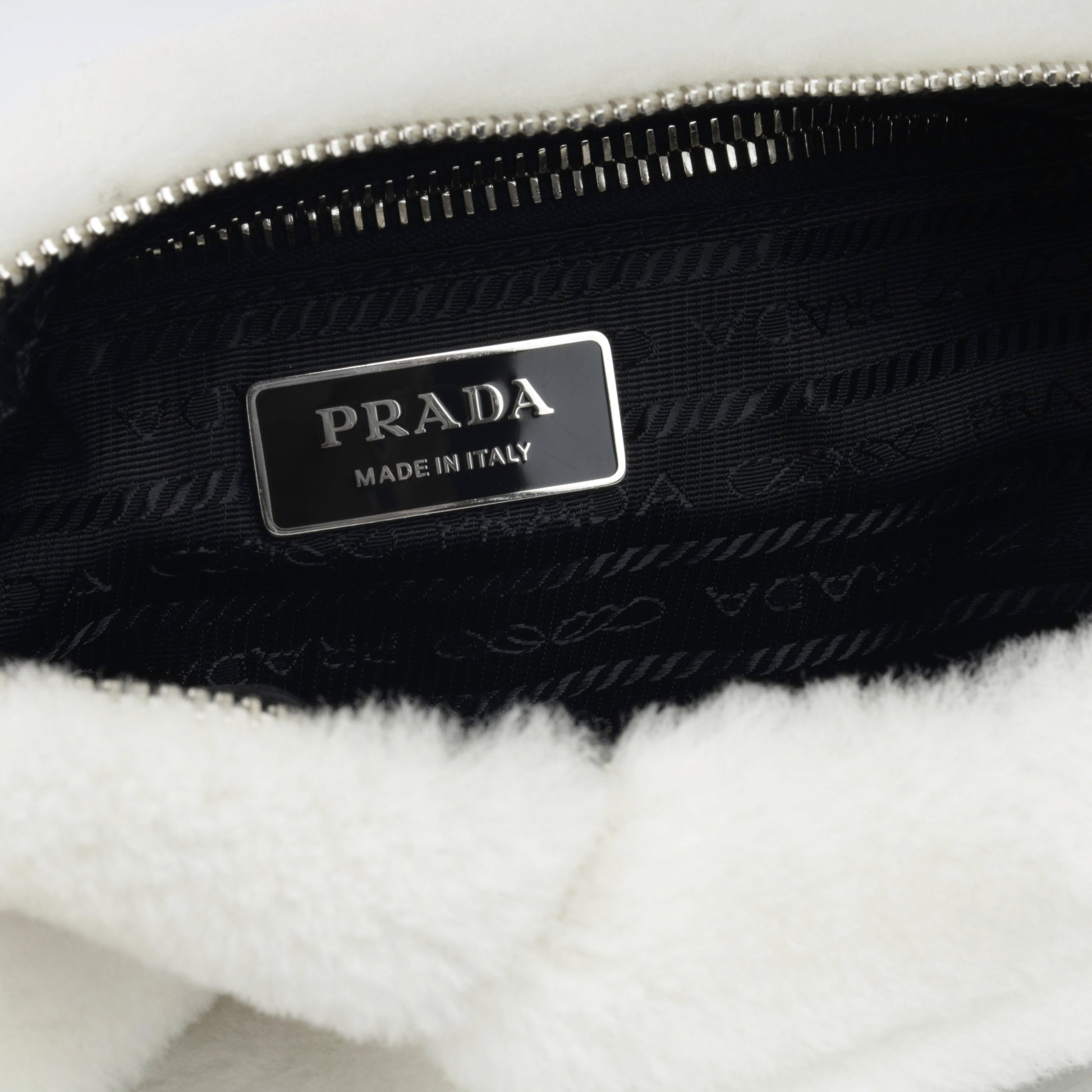 Indulge in a nostalgic journey back to the 2000s with this Prada shoulder bag, which is a modern reimagining of a design from that era. Crafted from quilted white shearling, it boasts a uniquely streamlined silhouette and is adorned with the iconic triangular logo plaque.
