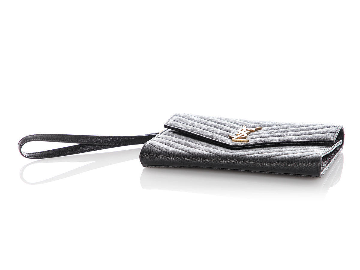 With just enough space for a phone and a few essentials, Saint Laurent’s Black Grain de Poudre Cassandre Matelassé Flap Pouch is a perfect piece for a night out! Made of black chevron-quilted leather with gold YSL monogram hardware on the front, the flap secures with a snap, opening to black fabric lining with one slide pocket inside. New and never worn with a dustbag, the 8.5-inch detachable wristlet makes it easy to grab and go!