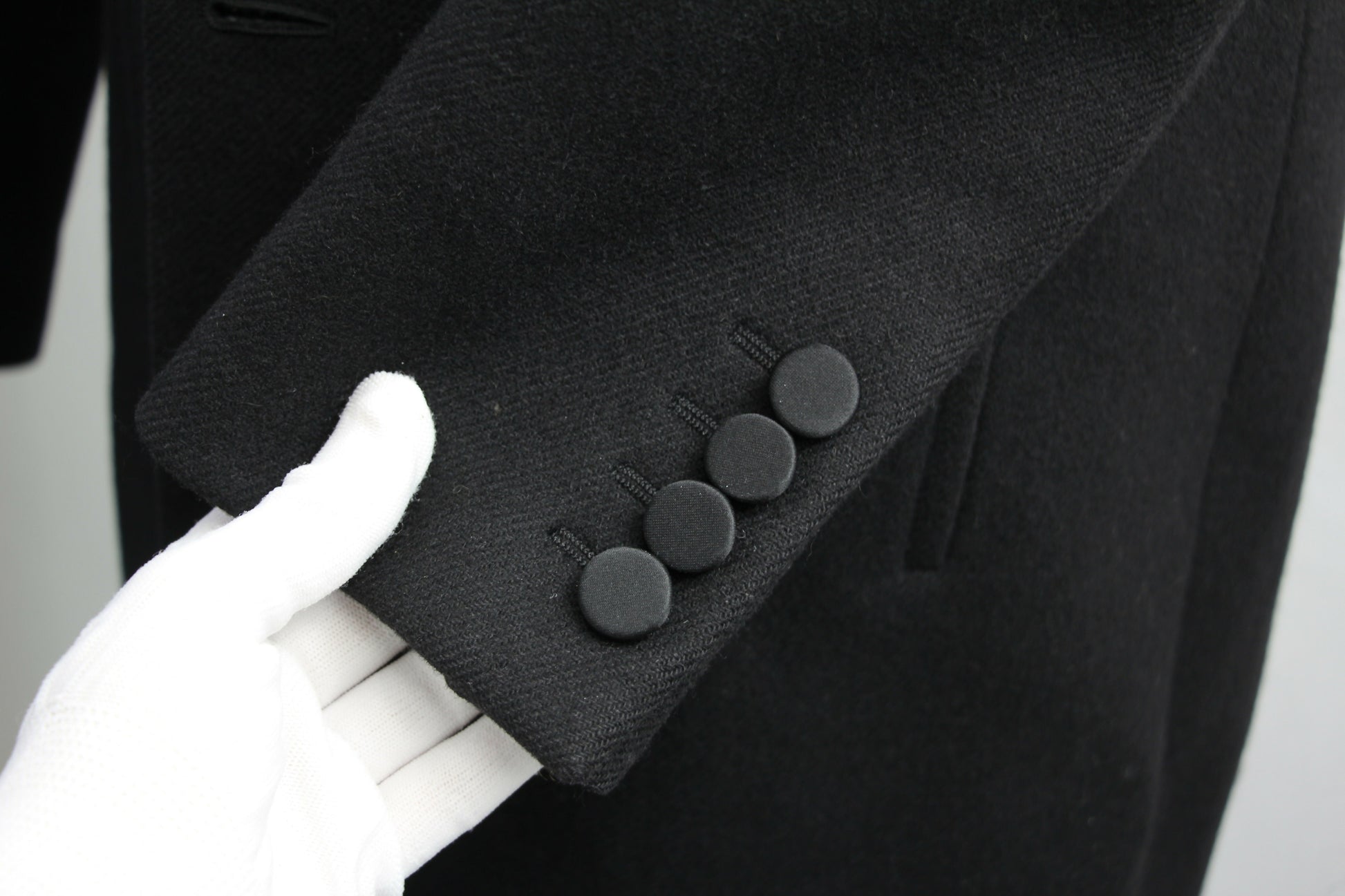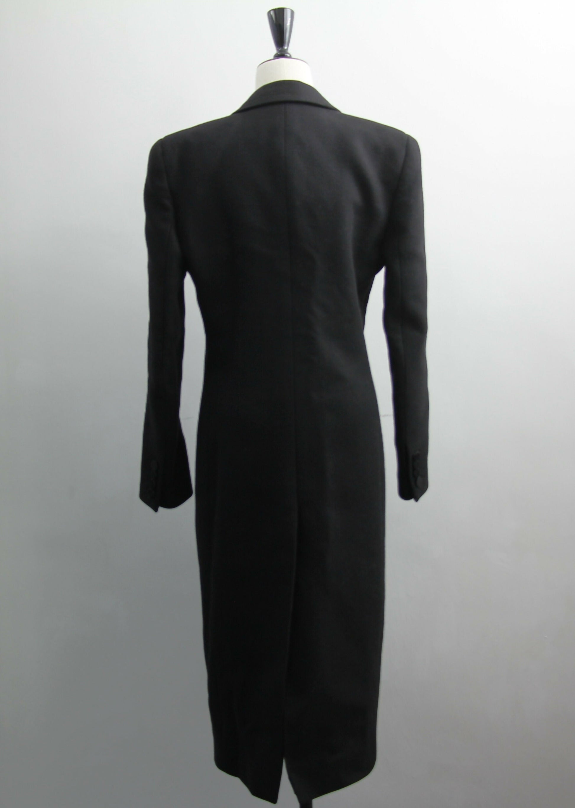 Expertly tailored from premium grain de poudre fabric, this Saint Laurent Black Tuxedo Coat exudes luxury and sophistication. The sleek design is enhanced by the twisted stripe texture of the YSL logo brooch, elevating the overall look with a touch of modern elegance. Perfect for formal occasions and adding a unique twist to your ensemble. Size S