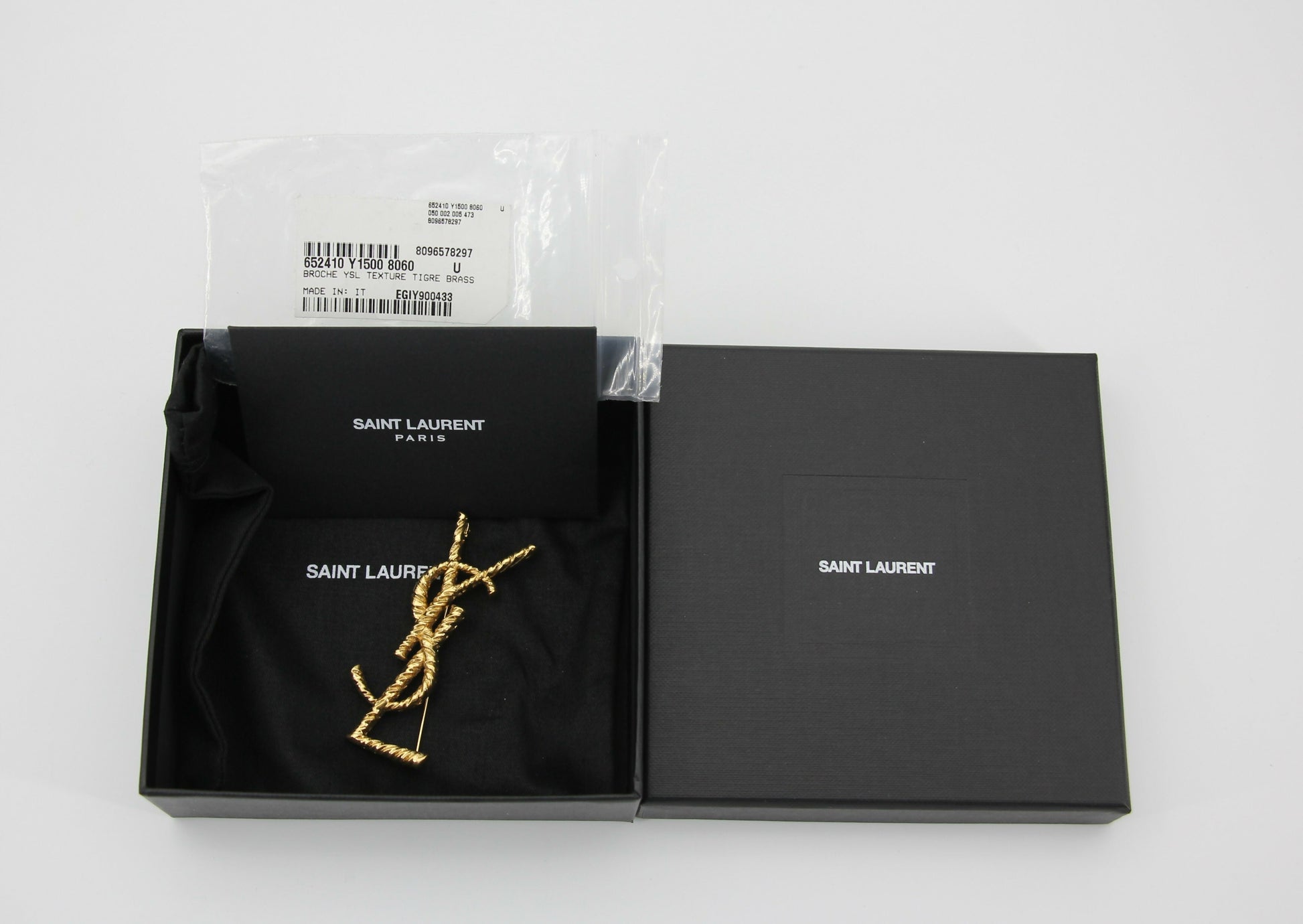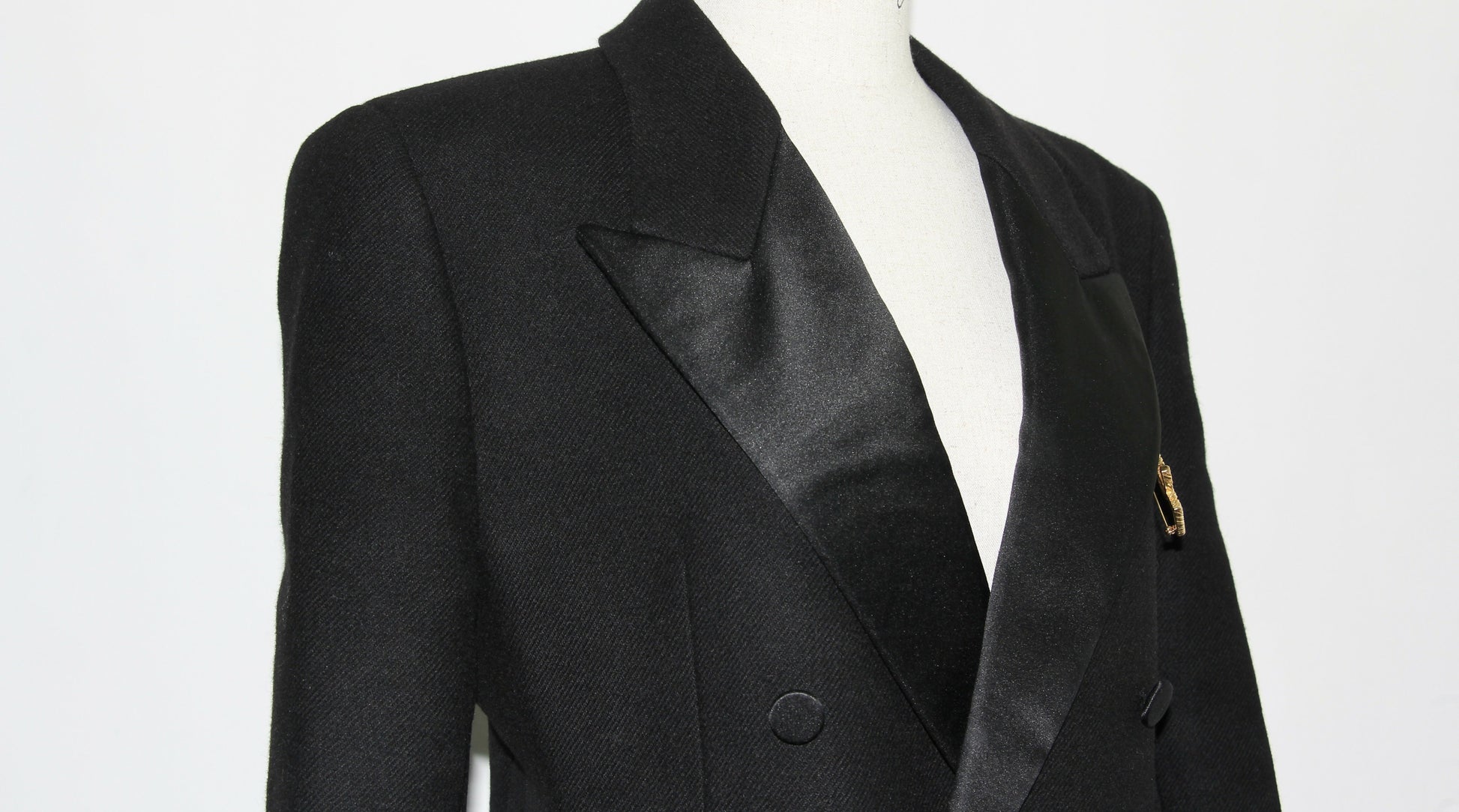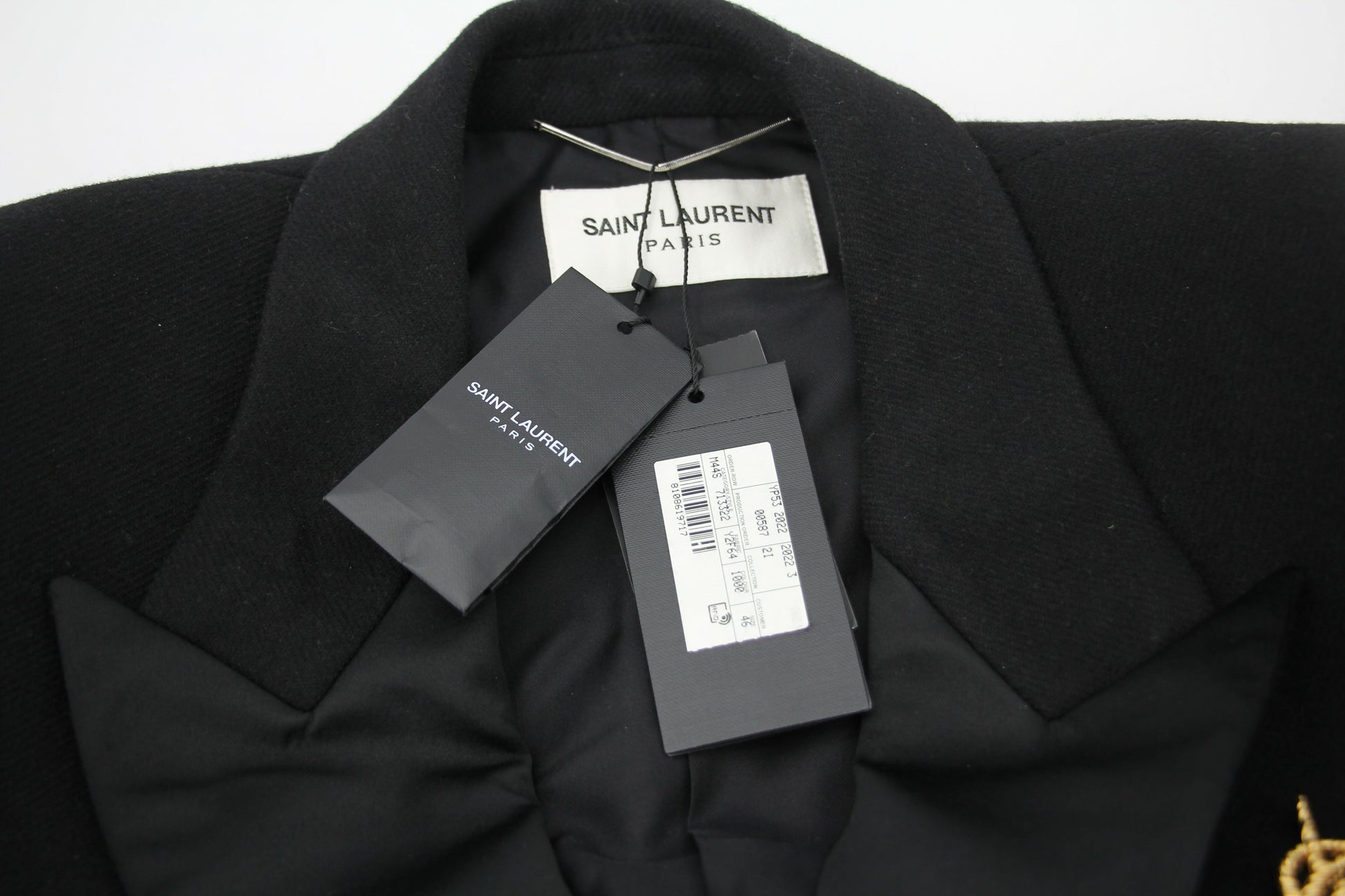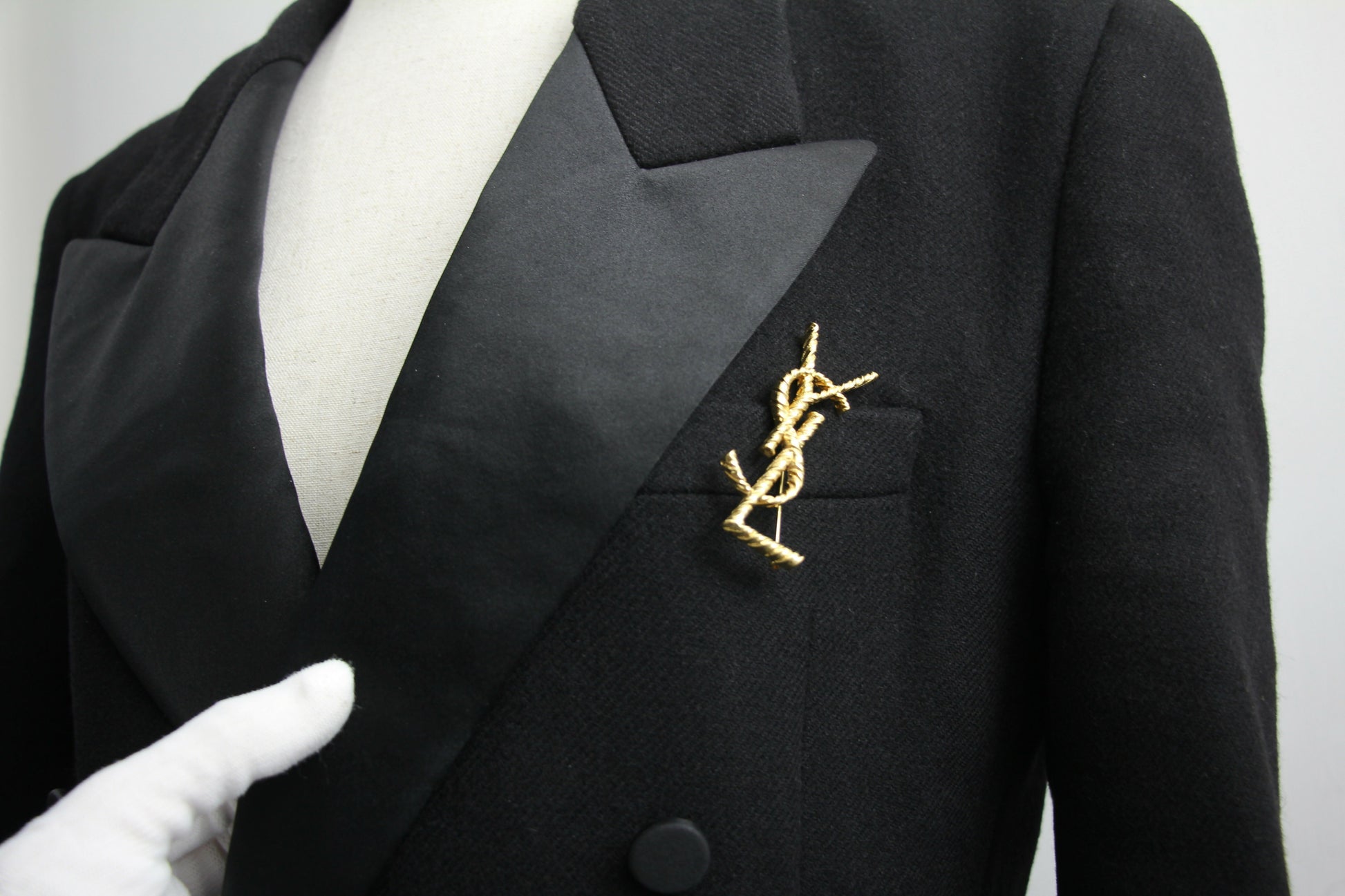 Saint Laurent Black Tuxedo Coat In Grain De Poudre + Saint Laurent YSL Logo Twisted Stripe Texture Brooch