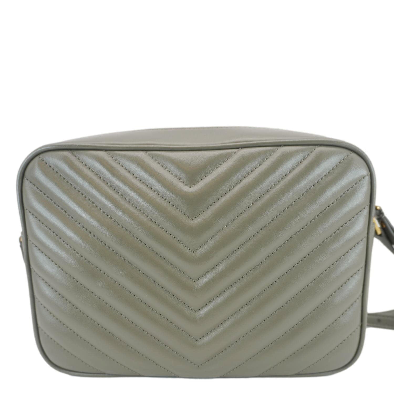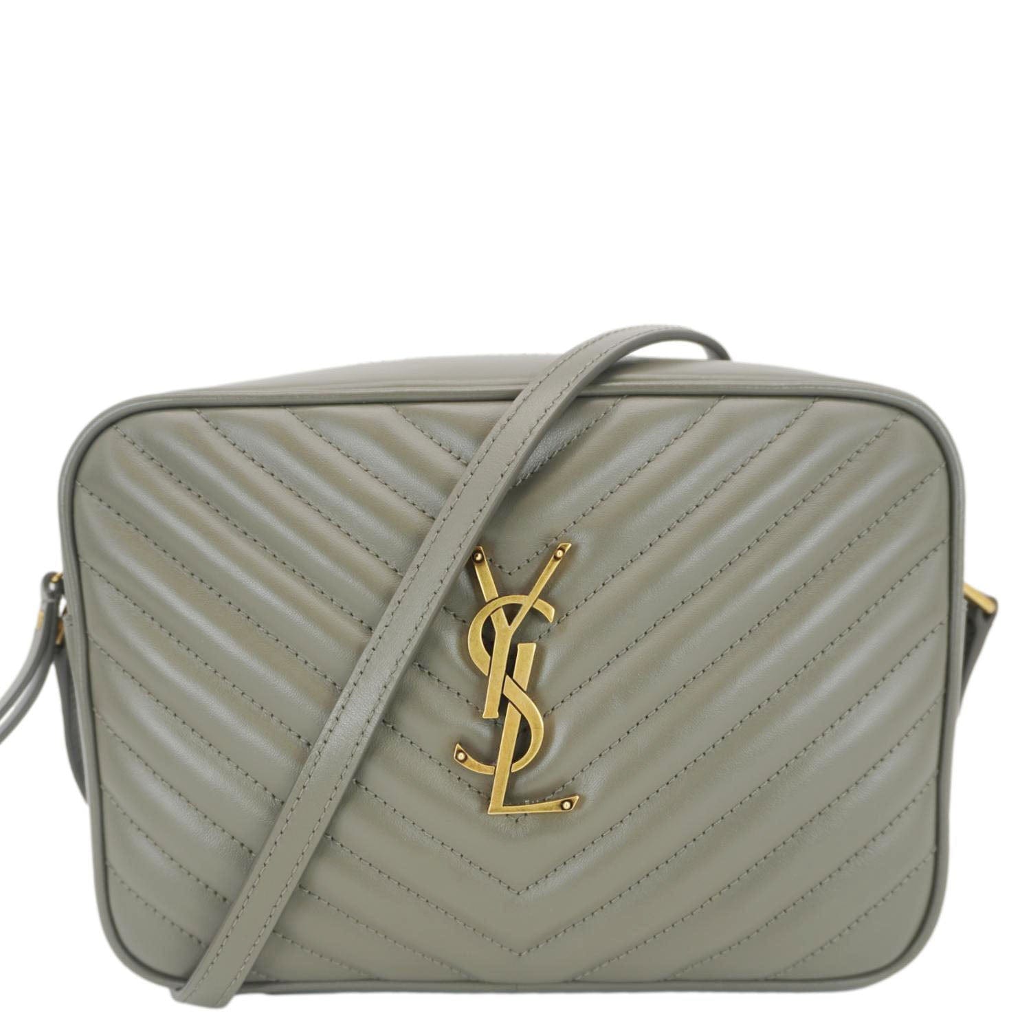 The Yves Saint Laurent Lou Camera Monogram Shoulder Bag in gray leather is a chic and versatile accessory. Featuring the iconic YSL logo on the front, a quilted design, and a chain strap, it adds a touch of sophistication to any outfit.