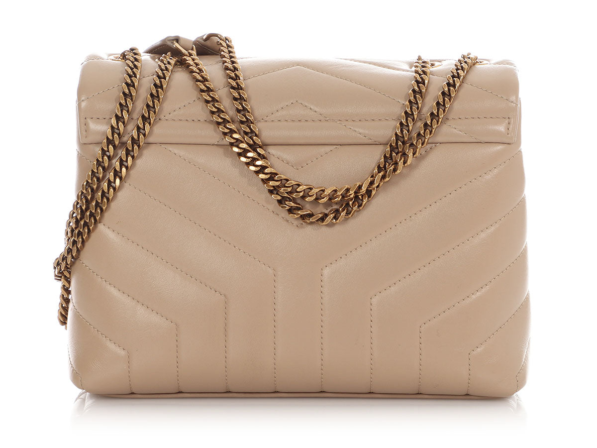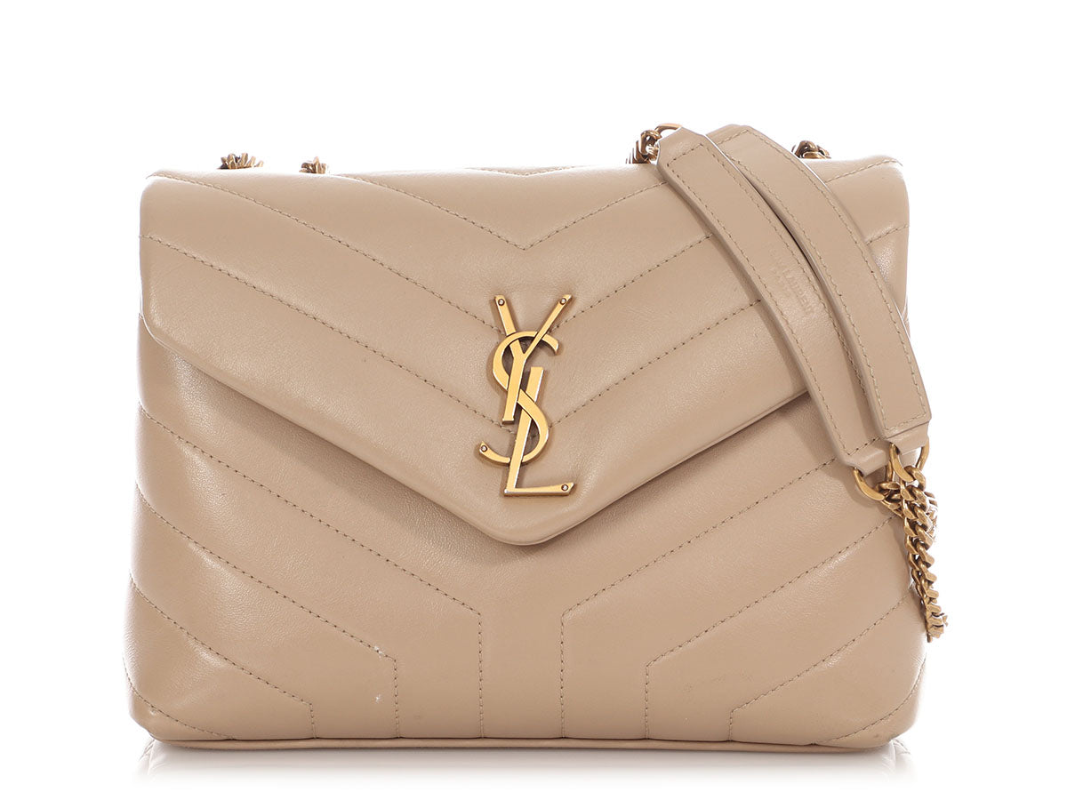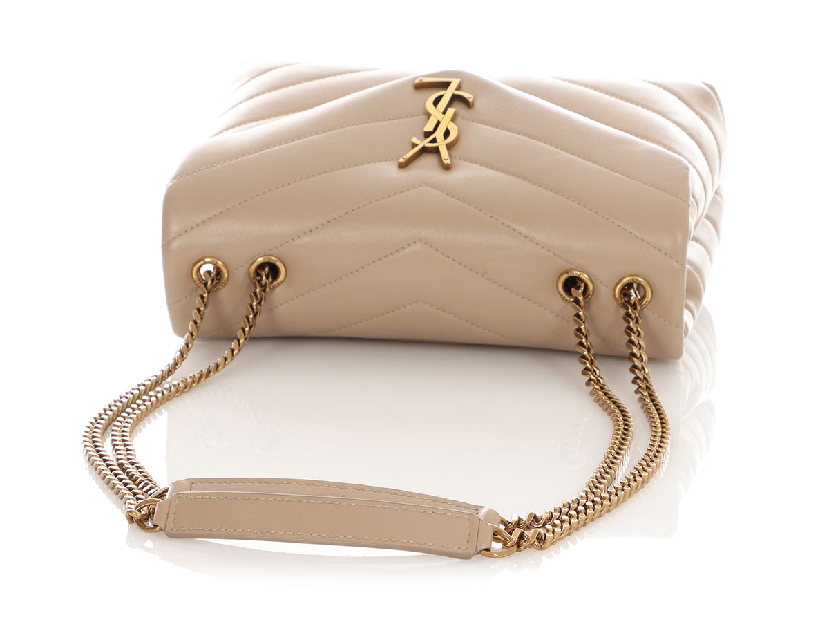 The second smallest of the Loulou siblings, Saint Laurent’s Small Beige Loulou is petite and polished! Made of chevron-quilted beige leather, it has a gold YSL monogram on the magnetic flap and a leather-topped chain strap that can be worn doubled up with a 12-inch drop or worn long with a 22.5-inch drop. Inside you’ll find a black-fabric-lined interior divided into two sections by a center zipped pocket and one slide pocket on the back wall. In very good condition with a dustbag, box, and cards, it has wear on the corners, scratches on the hardware, light scratches throughout, indentations on the back, a few marks inside, a few small stains on the bottom, and a faint, thin mark (maybe pen?) on the front near the bottom. Bigger than the Toy and smaller than the Medium, this Small Loulou is just the right size for the luxury-lover who doesn’t need to carry much!