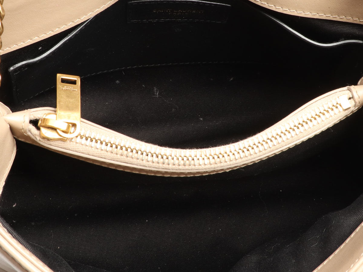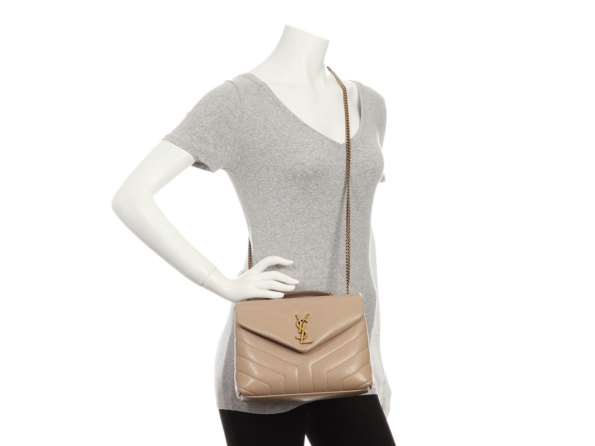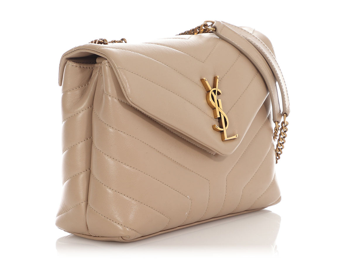 The second smallest of the Loulou siblings, Saint Laurent’s Small Beige Loulou is petite and polished! Made of chevron-quilted beige leather, it has a gold YSL monogram on the magnetic flap and a leather-topped chain strap that can be worn doubled up with a 12-inch drop or worn long with a 22.5-inch drop. Inside you’ll find a black-fabric-lined interior divided into two sections by a center zipped pocket and one slide pocket on the back wall. In very good condition with a dustbag, box, and cards, it has wear on the corners, scratches on the hardware, light scratches throughout, indentations on the back, a few marks inside, a few small stains on the bottom, and a faint, thin mark (maybe pen?) on the front near the bottom. Bigger than the Toy and smaller than the Medium, this Small Loulou is just the right size for the luxury-lover who doesn’t need to carry much!