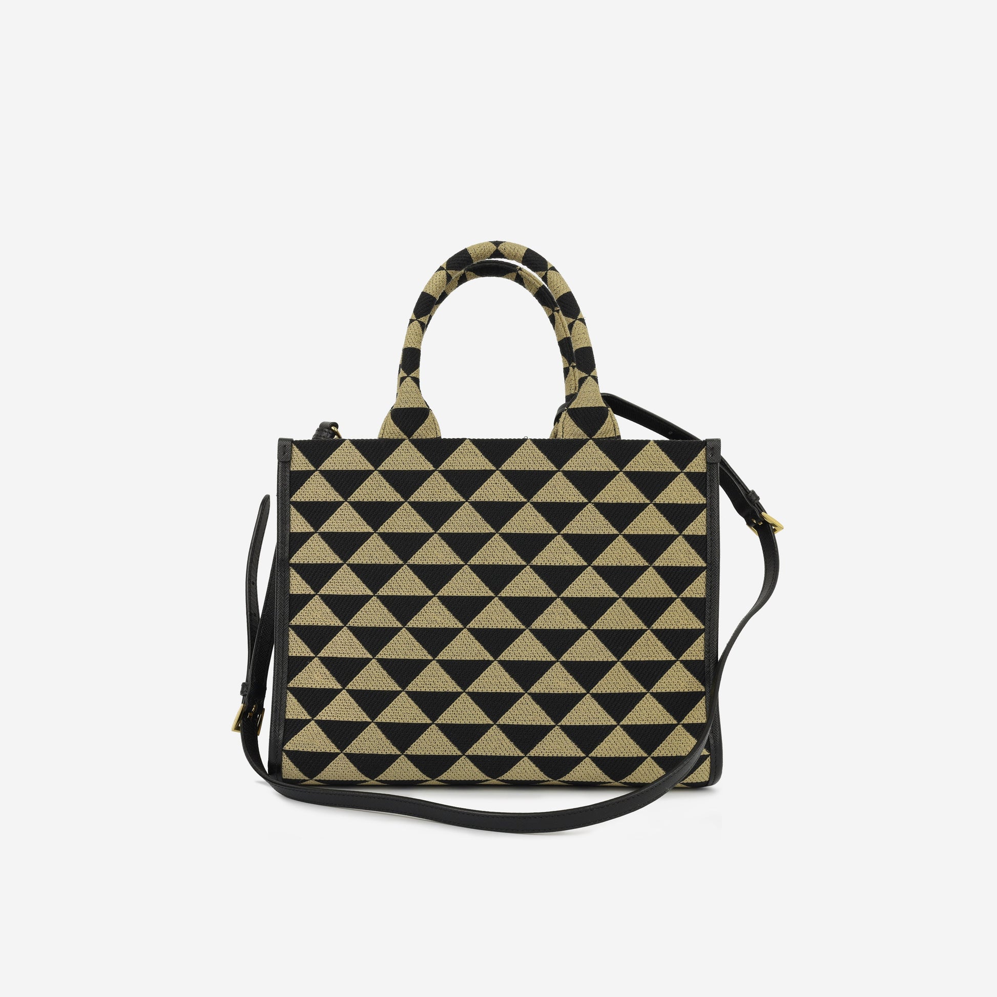 Inspired by the brand's iconic triangle motif. Originating from trunks designed by Mario Prada himself, the triangle symbolises uniqueness and modernity, reinvented in a fresh interpretation each season. This sleek tote bag showcases a sophisticated yet modernist pattern, meticulously crafted to play with contrasting colors and geometric shapes. The minimalist design exudes a contemporary charm, making it a versatile accessory for any occasion. Crafted from the finest materials, including the brand's iconic Saffiano leather, this tote bag boasts durability and luxury in equal measure. The addition of a detachable shoulder strap offers versatility, allowing you to wear it in different ways to suit your style.