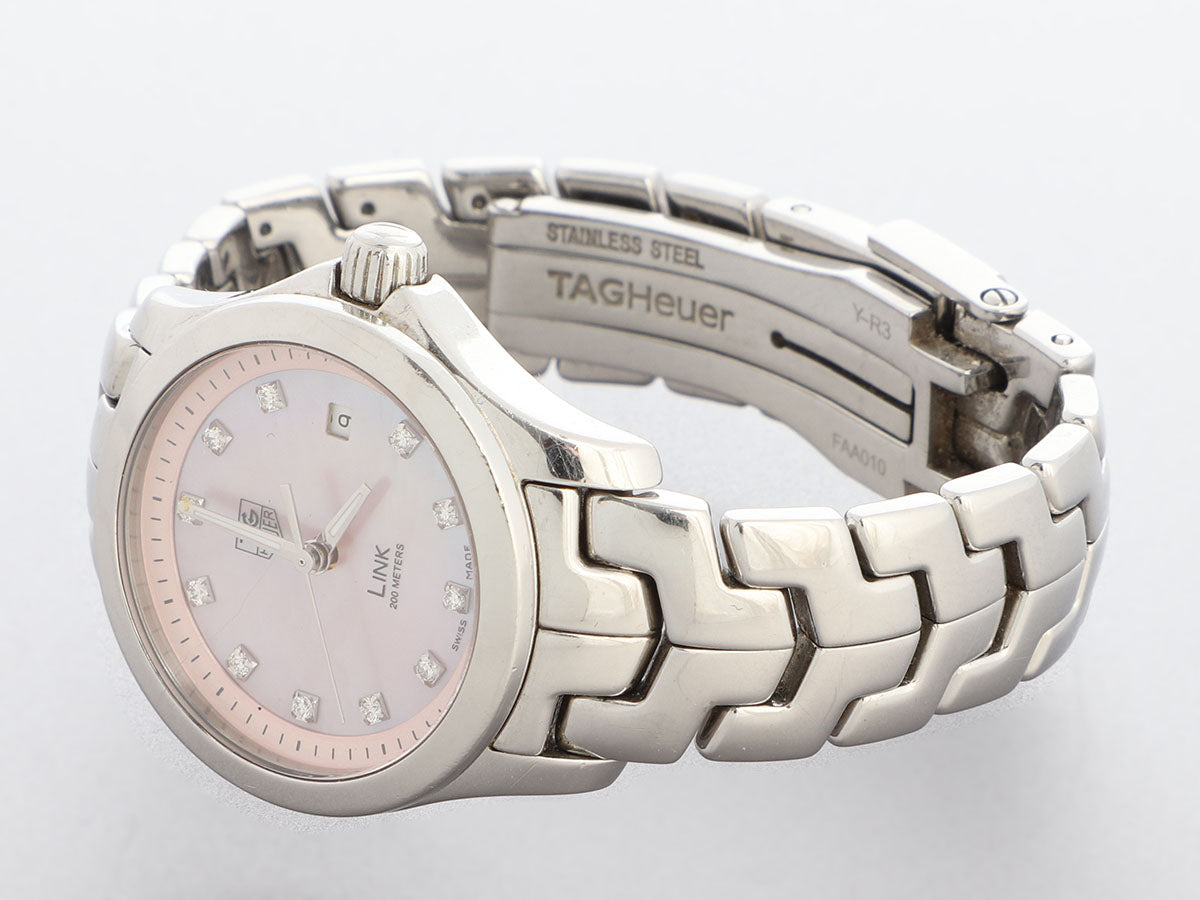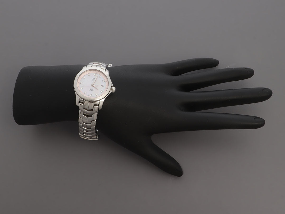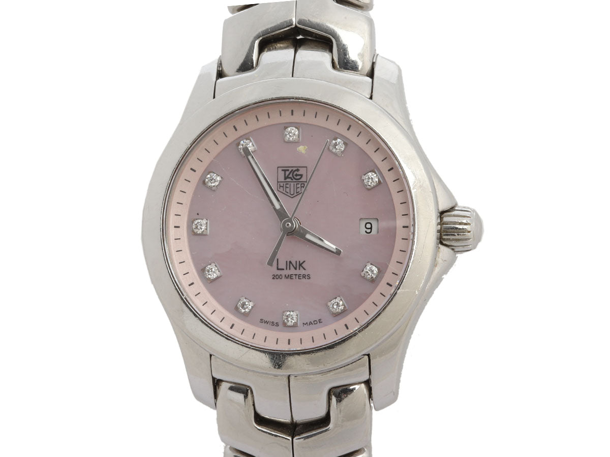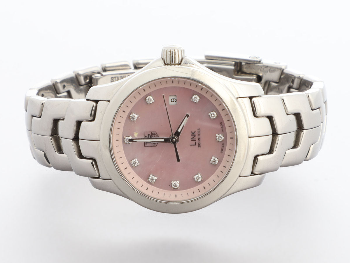 Tag Heuer’s Stainless Steel Diamond Ladies Link Watch 27mm is pretty with a pink mother of pearl dial! This Swiss-made quartz watch has 0.6 carats of diamond hour markers, luminous silver-tone sword-shaped hour and second hands, a date window at the 3 o’clock position, and secures on the wrist with a push-button deployment clasp. In previously loved condition with scratches on the metal, it comes with extra links and a certificate. This Link watch is water resistant to 200 meters!