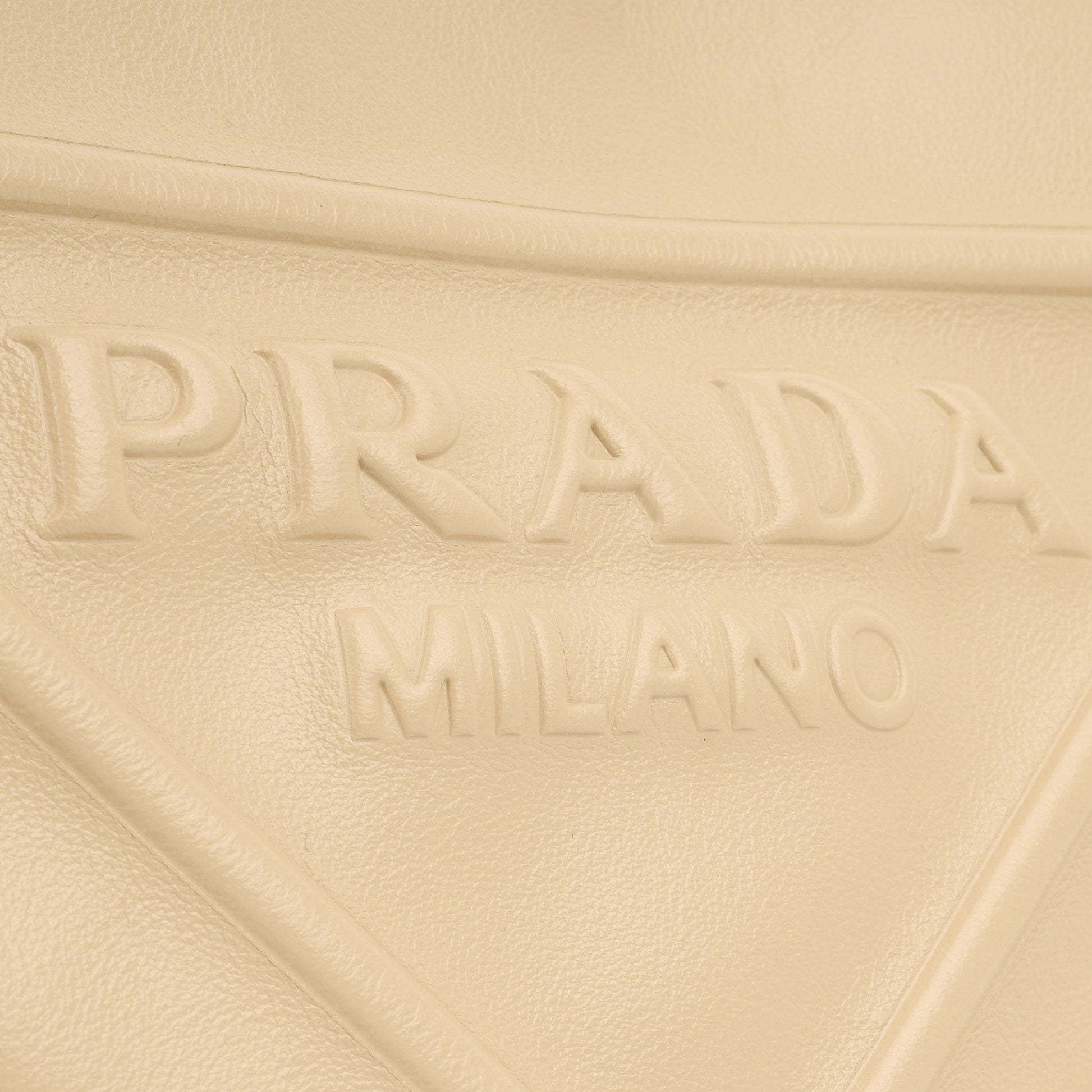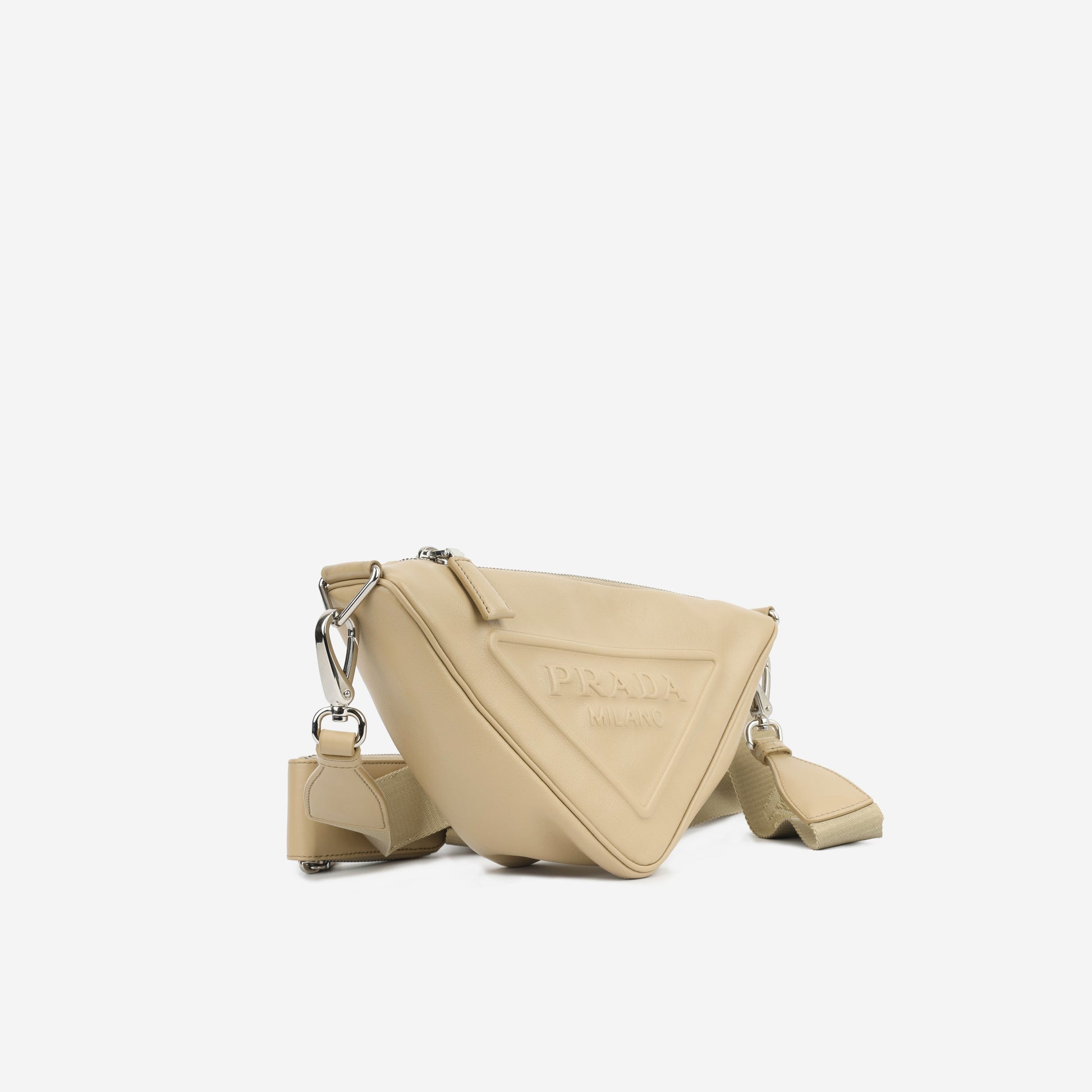 Introducing the Prada Geometric Triangle Shoulder Bag, a sleek and versatile accessory. Inspired by geometric elements, its minimalist design features a tonal embossed logo and an enameled metal triangle logo on the back. Complete with a shoulder strap for easy wear, this bag effortlessly blends heritage with modernity.