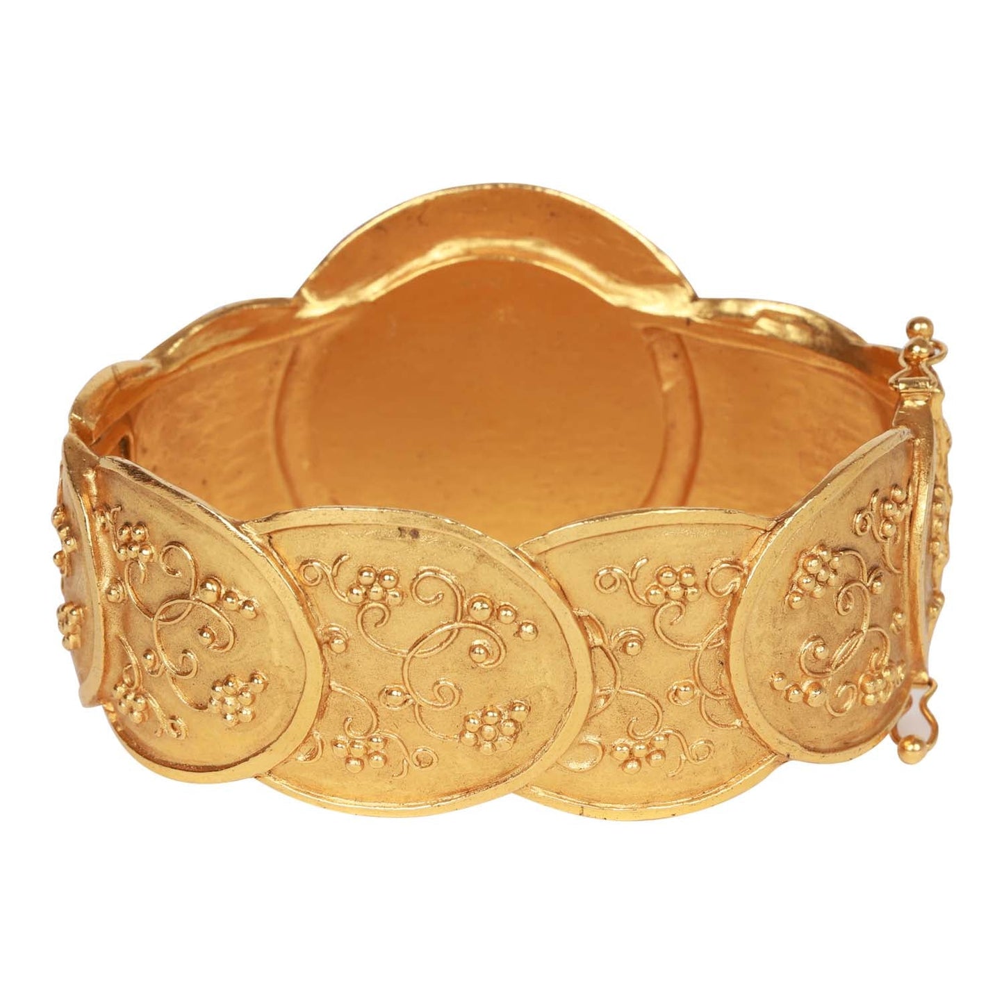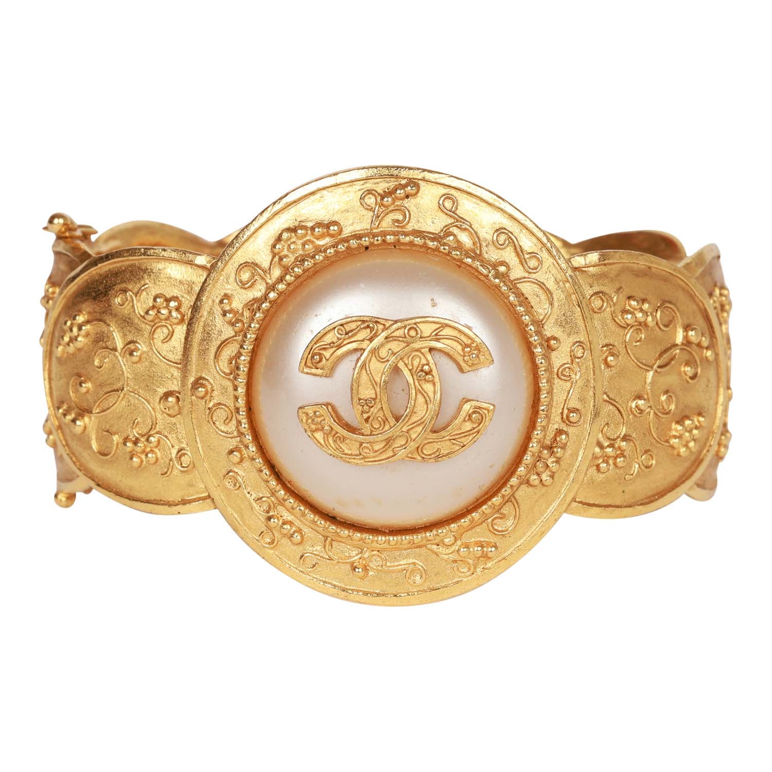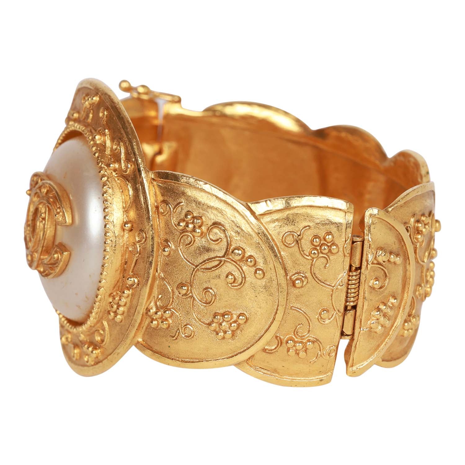 Chanel Vintage Gold Faux Pearl Textured Metal CC Logo Bracelet