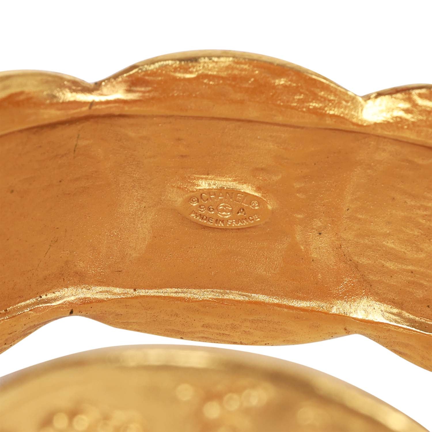 This vintage 1996 bracelet is in gold tone metal with a CC logo over a faux pearl and a hinge clasp bangle closure.