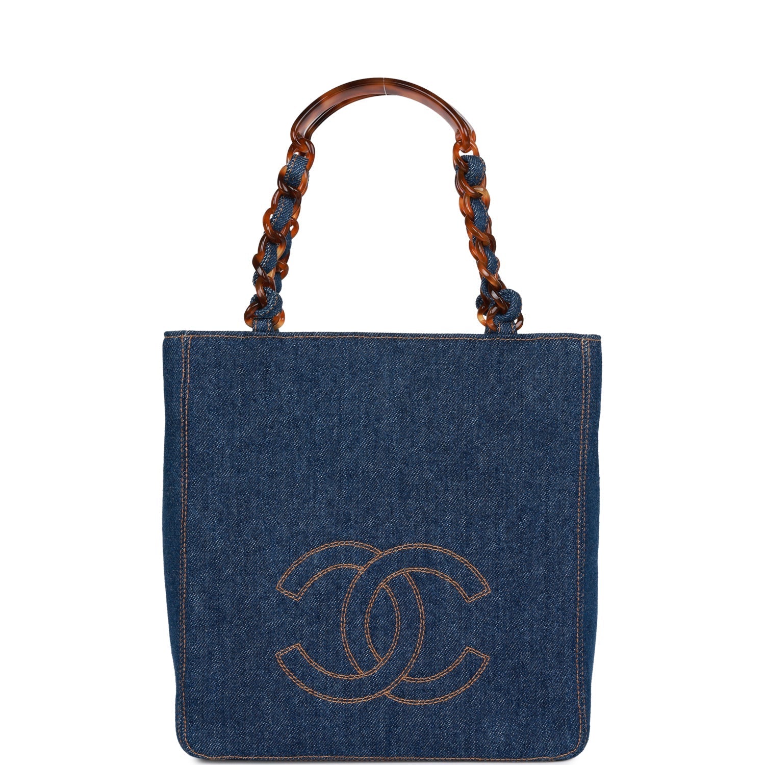 This is a Vintage Chanel tote bag in blue denim with tortoiseshell bakelite hardware, featuring a stitched CC logo on front, two tortoiseshell bakelite interwoven shoulder straps, and a snap closure.