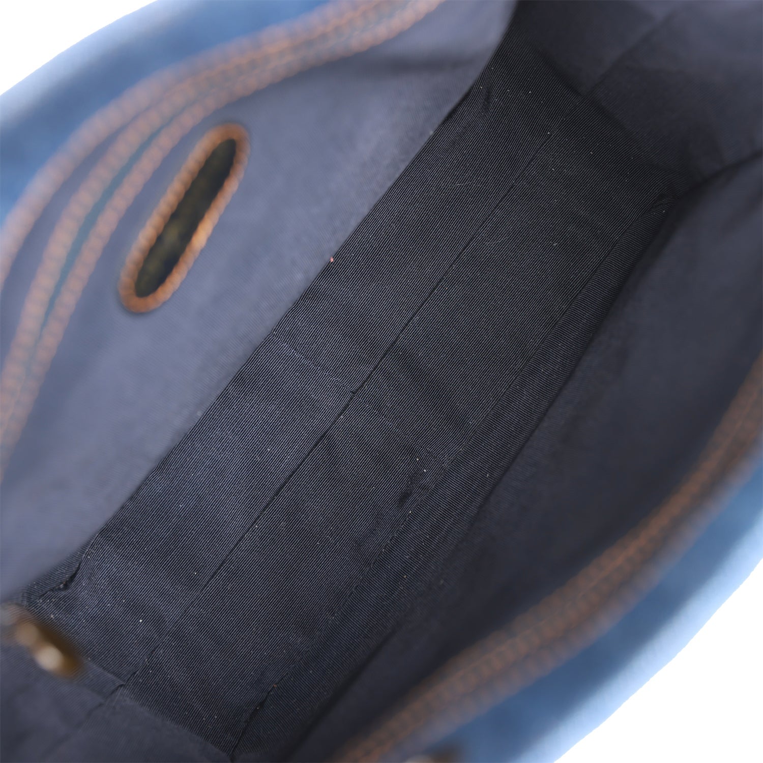 The interior is lined in blue fabric and includes two zip pockets.