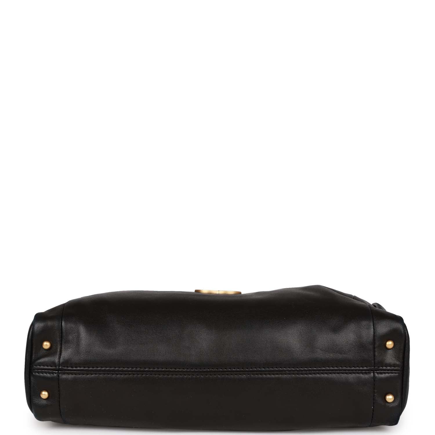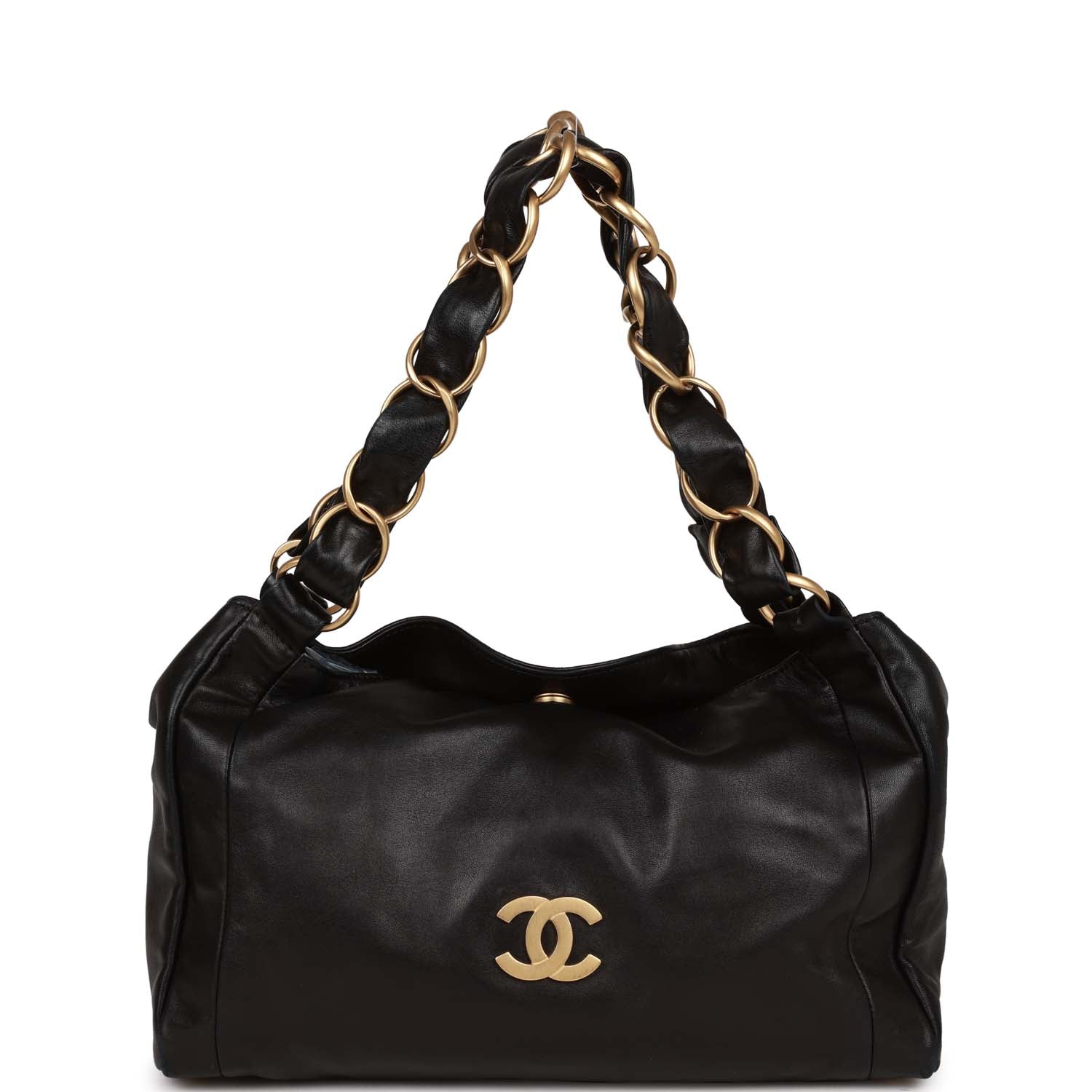 This Vintage "Olsen" Hobo Shoulder Handbag is in Black lambskin leather with with brushed gold hardware, a brushed gold plated CC logo on front, and interwoven black leather and brushed gold hardware shoulder straps.