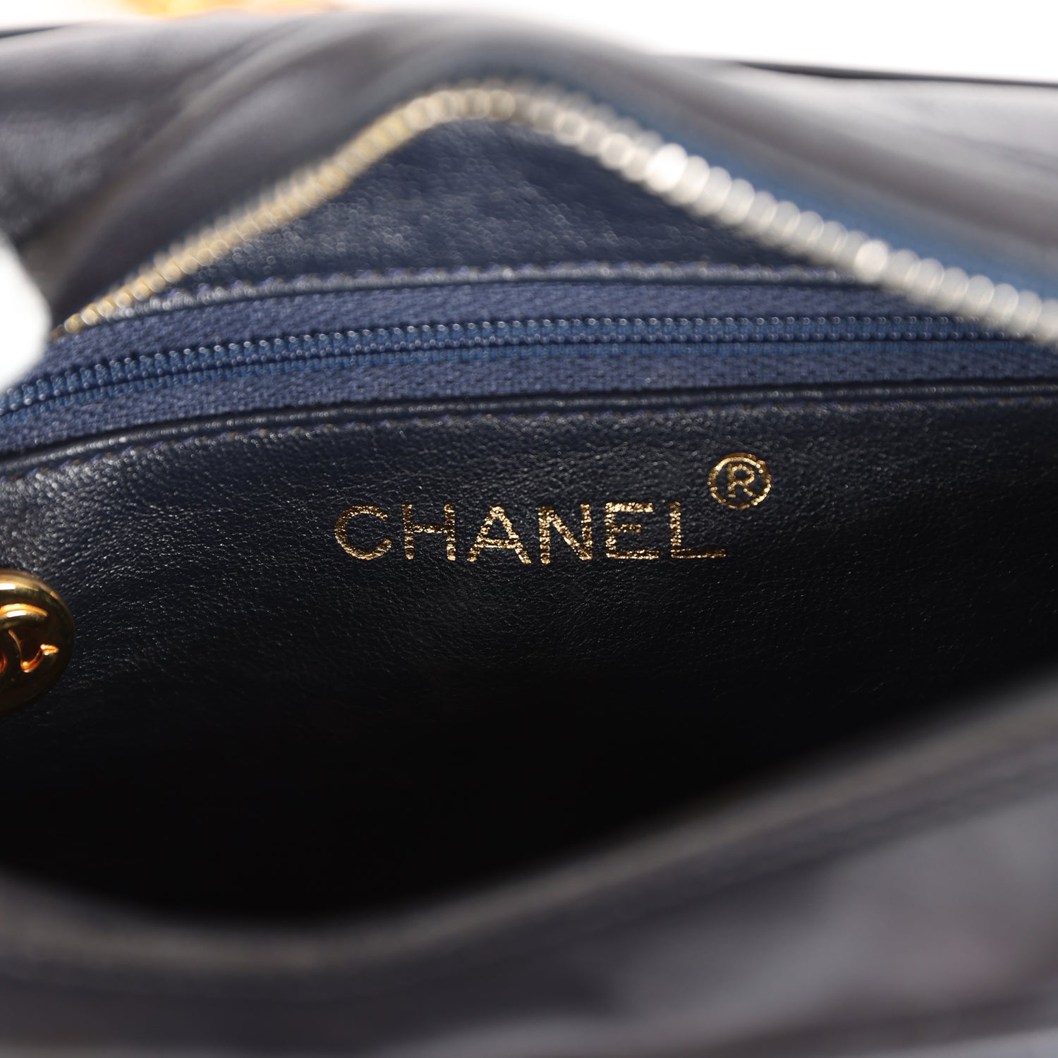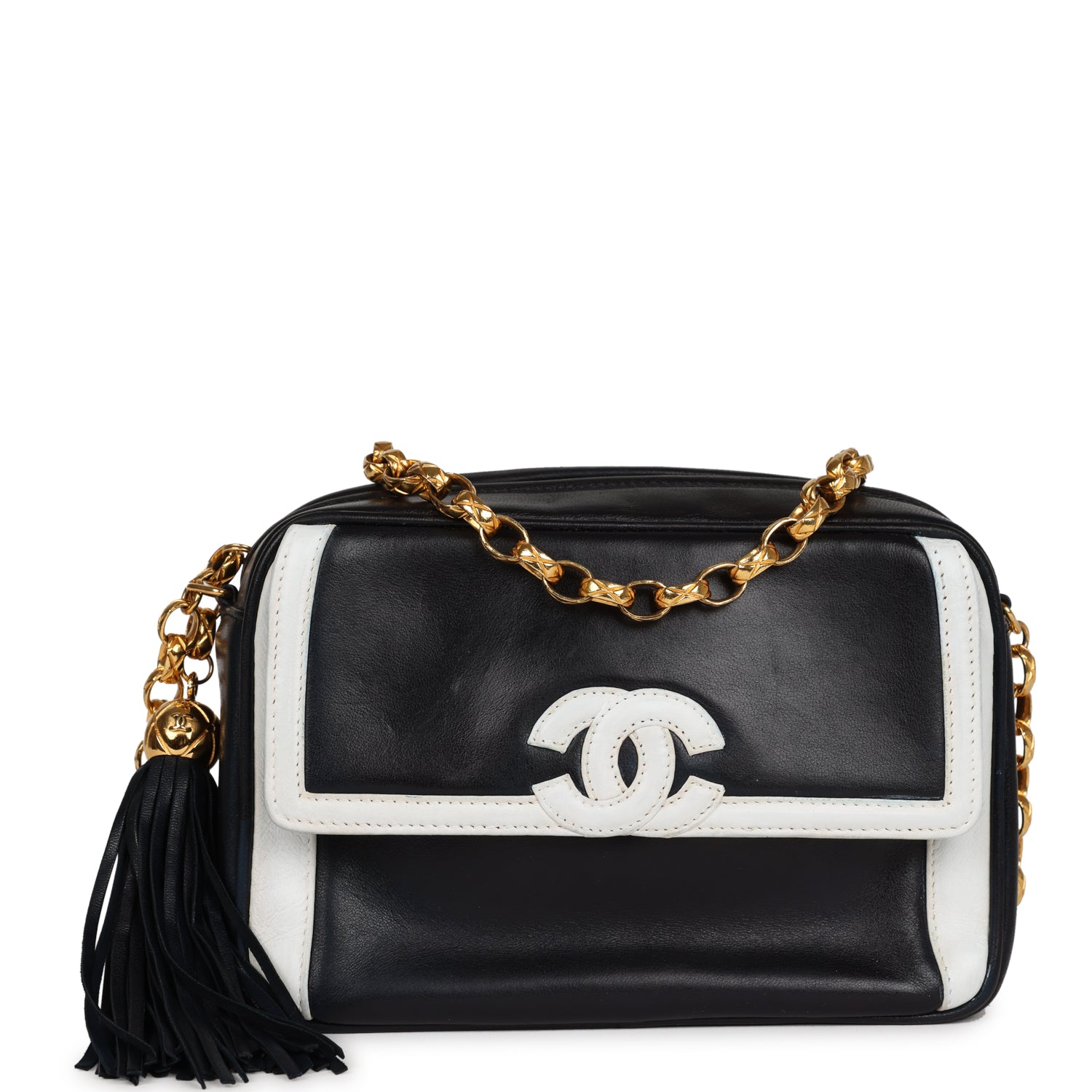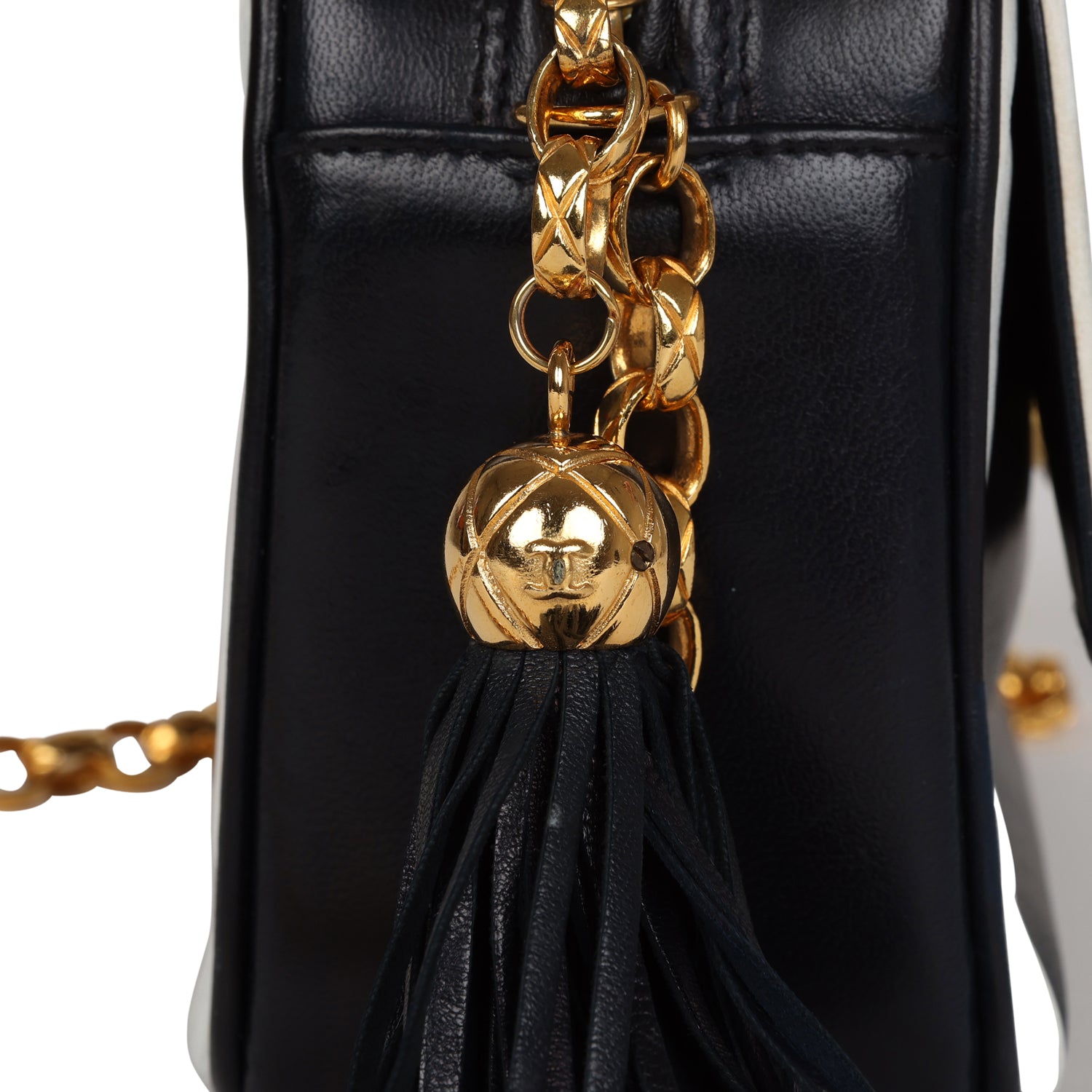 Chanel Vintage Fringe Chain Camera Bag Navy and White Lambskin Gold Hardware