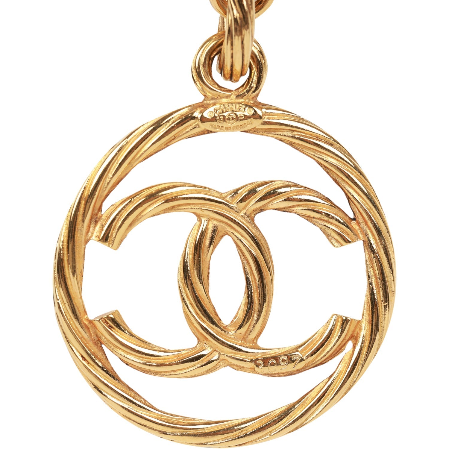 This vintage 93P necklace is in gold plated metal featuring a classic encircled CC pendant, long link chain, and a springring closure.