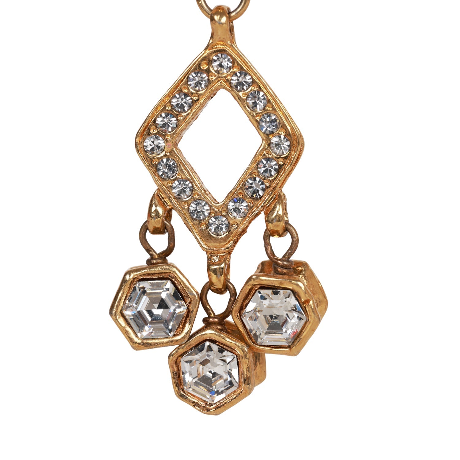 These vintage Chanel chandelier earrings have 24K gold plated textured CC ear clip from which a 24K gold plated and rhinestone diamond and three round rhinestones dangle.