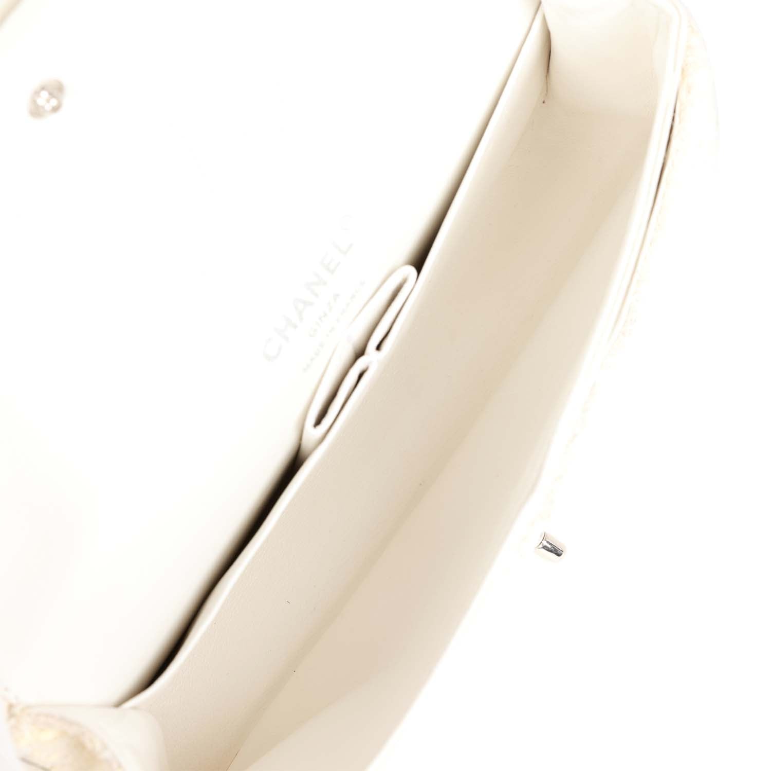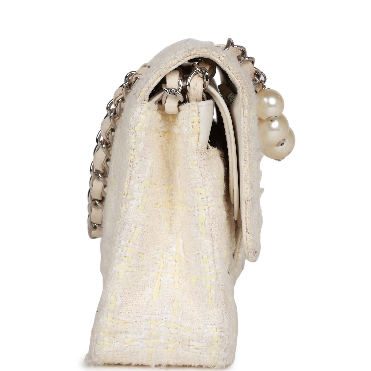 This Medium Flap bag is in White tweed boucle fabric with silver hardware and features a front flap with signature CC turnlock closure and an adjustable interwoven silver tone chain link and white leather shoulder strap with dangling faux pearls.