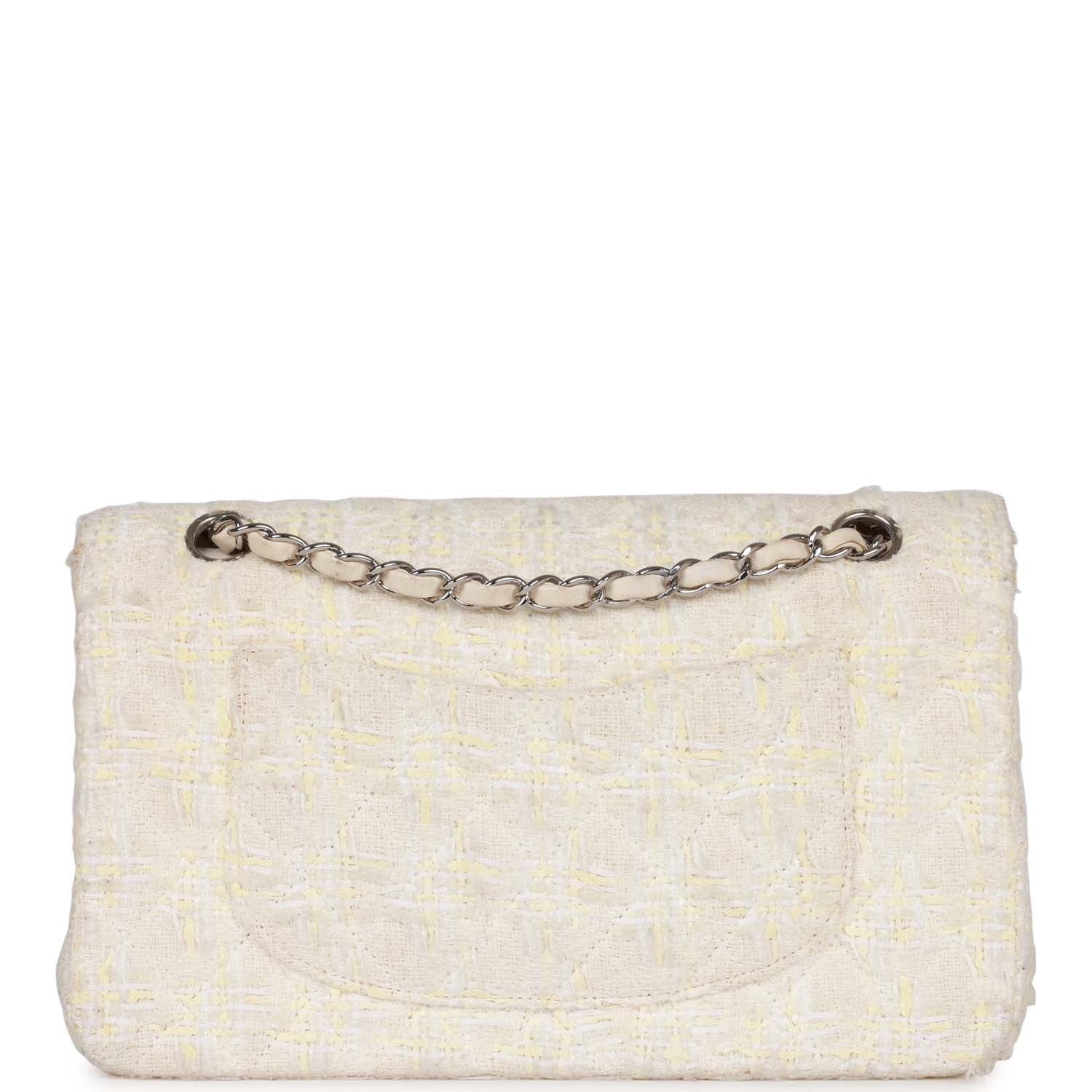 Chanel Vintage Medium Double Flap Bag White Tweed Silver Hardware