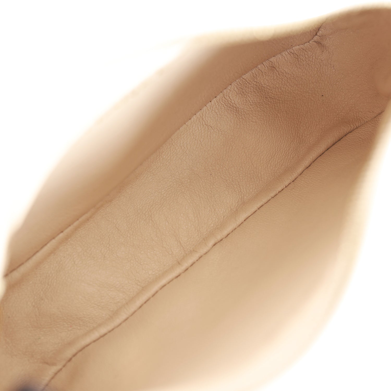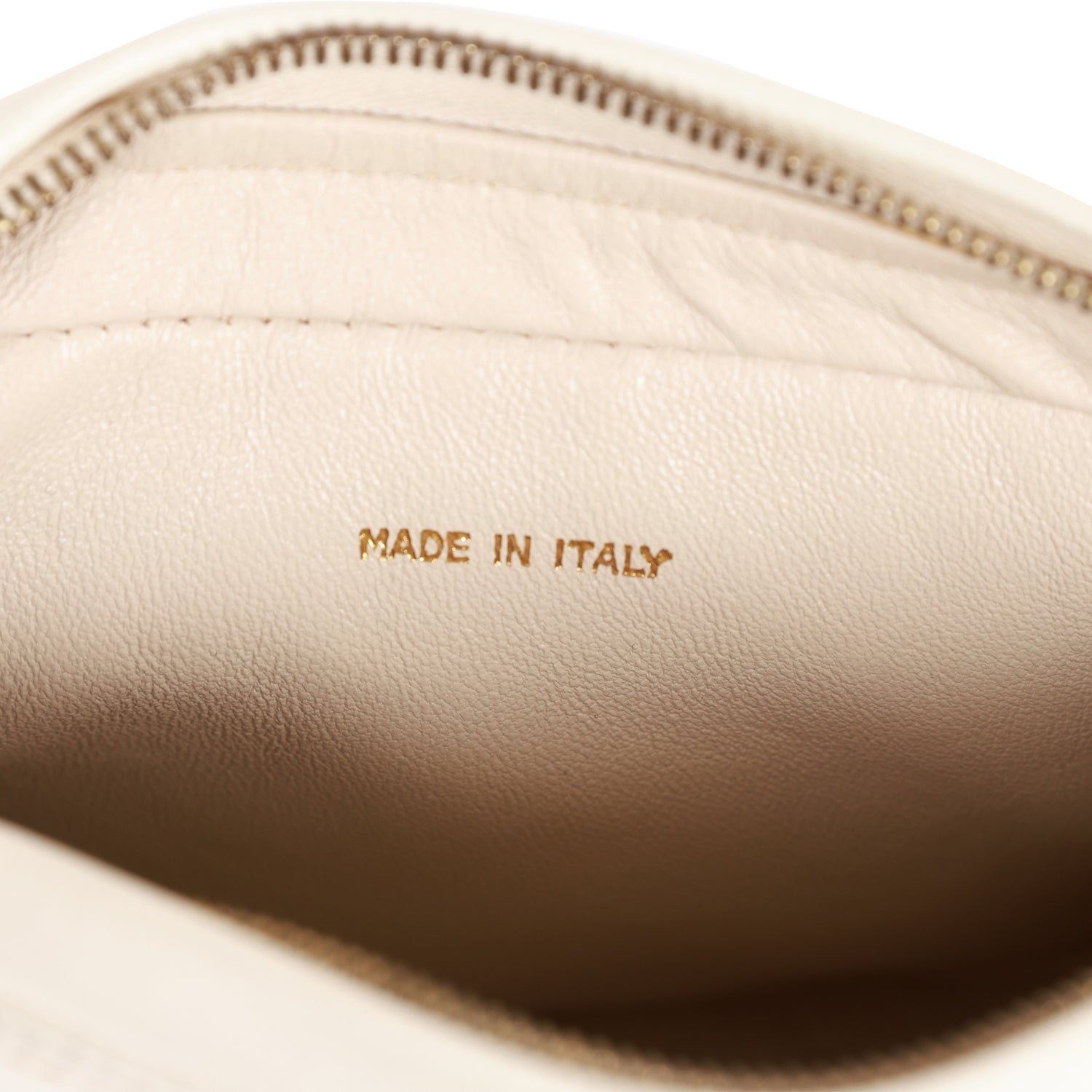 The interior is lined in beige leather and includes one zip pocket on the back wall.