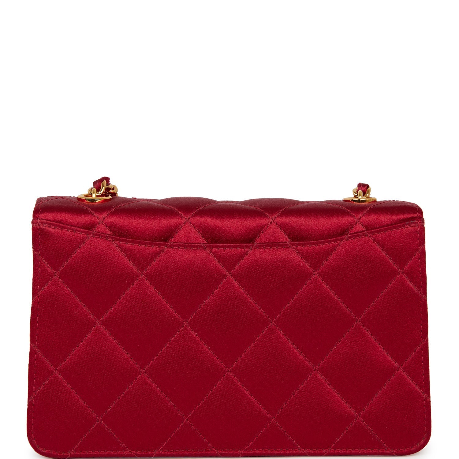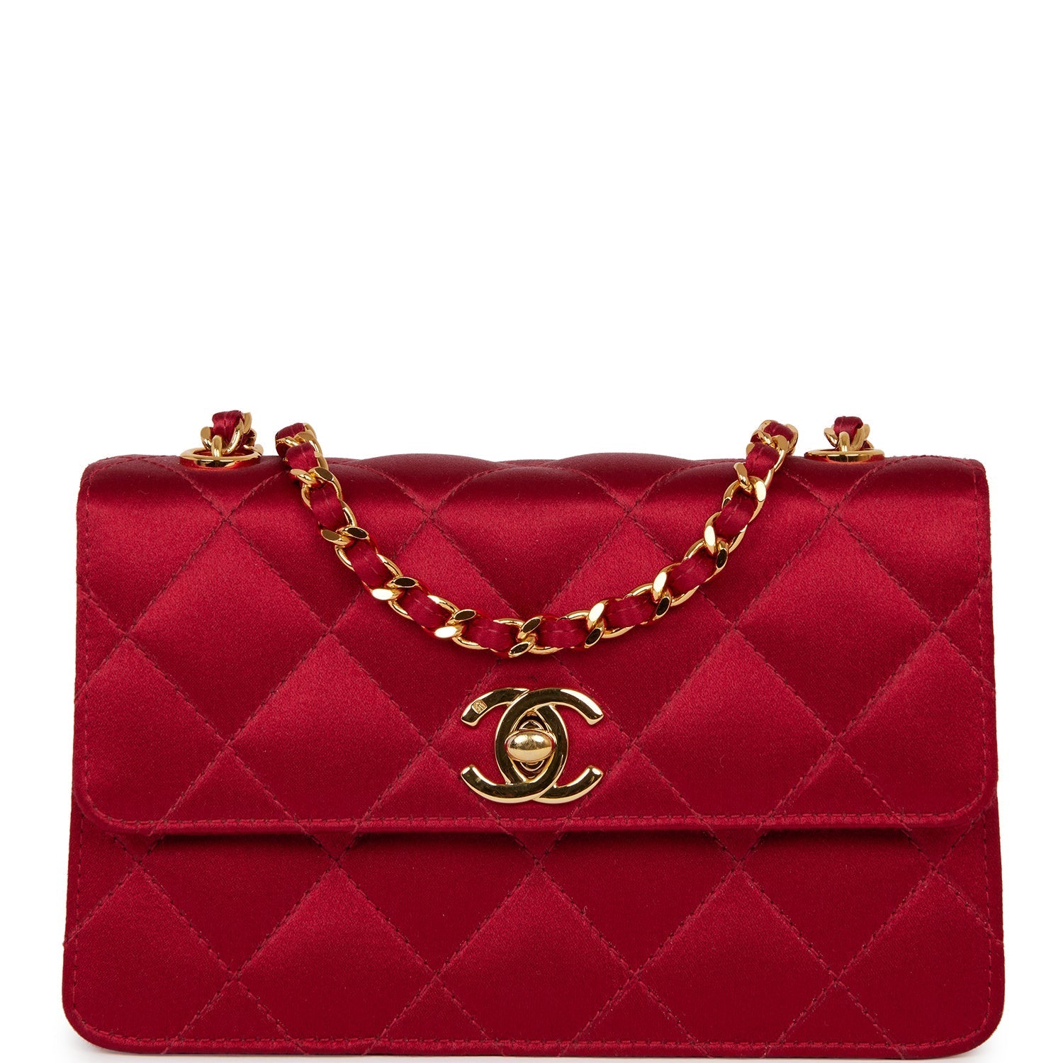 A Vintage Chanel Mini flap bag in red satin with gold hardware, featuring a front flap with classic gold plated CC turnlock closure and red satin and gold chain link shoulder straps.