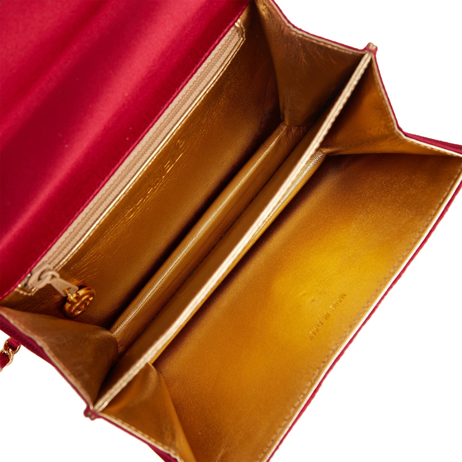 The interior is lined in gold leather and includes one zip pocket on the back wall as well as a center divide.