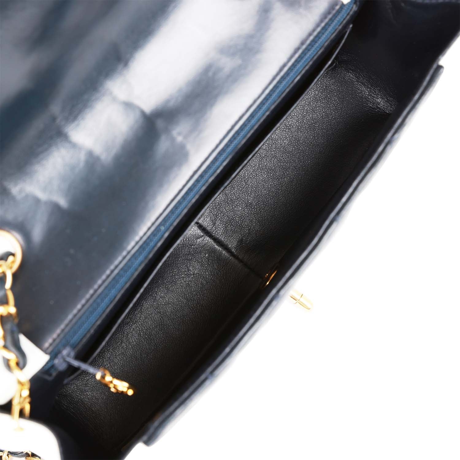 This Vintage Small Diana flap bag is in navy and white lambskin leather with gold plated hardware, front flap with CC turnlock closure, and interwoven gold plated chain link and navy leather shoulder/crossbody strap