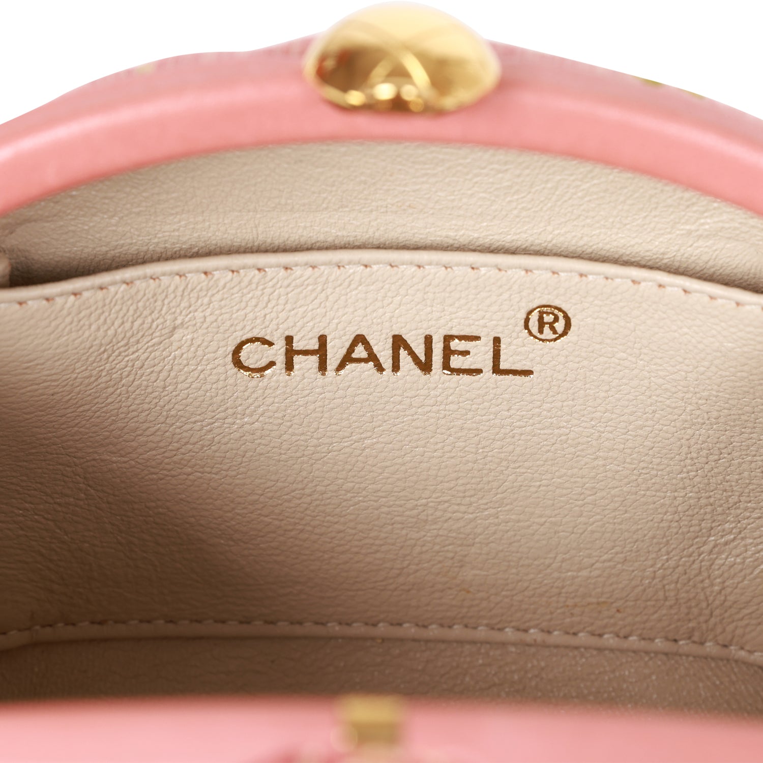 This Vintage Clutch is in Rose Pink brocade silk with gold tone hardware and has the signature CC stitched at center, rose fringe detail, and top clasp frame closure.